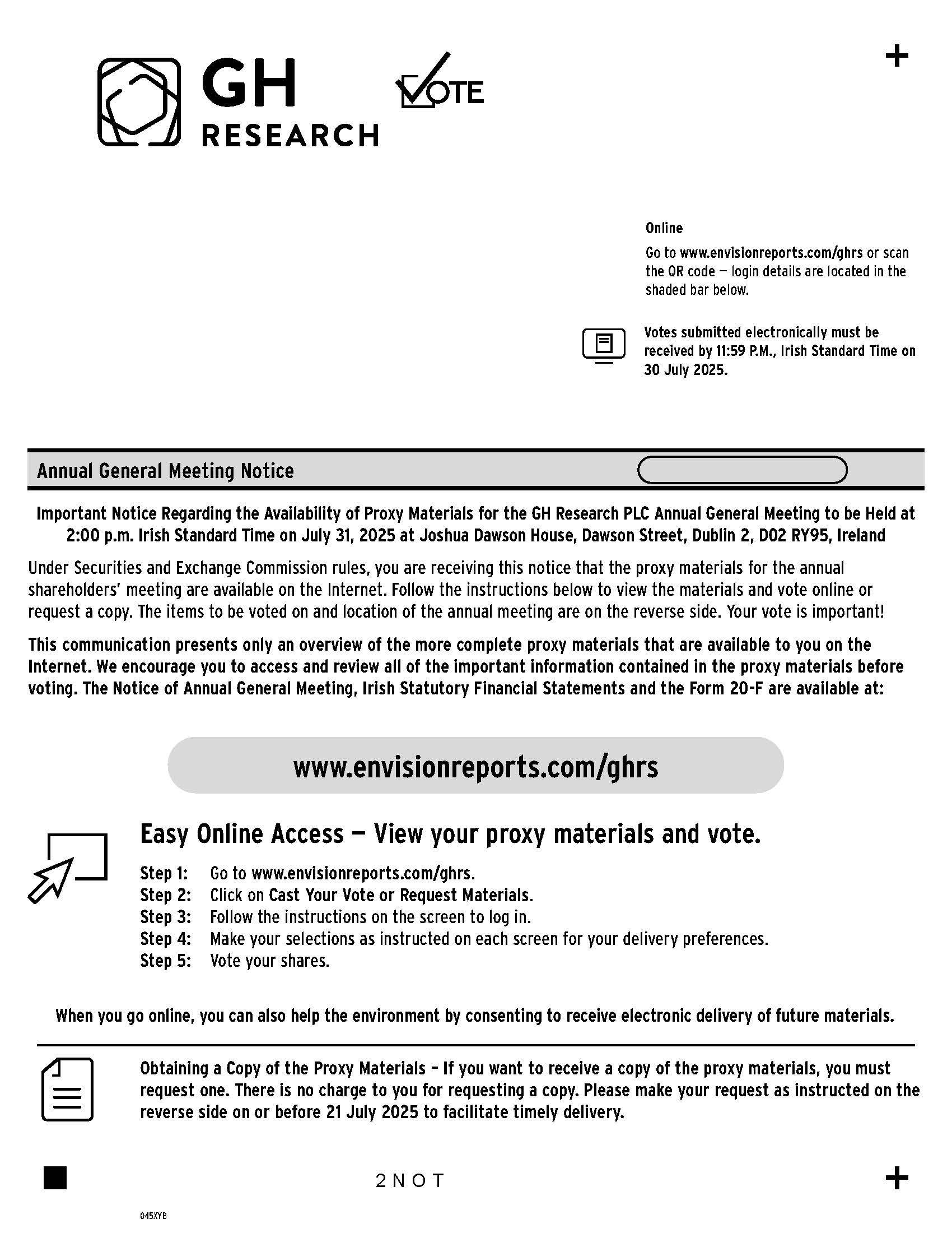 Step 1:  Step 2:  Step 3:  Step 4:  Step 5:  Go to www.envisionreports.com/ghrs.  Click on Cast Your Vote or Request Materials. Follow the instructions on the screen to log in.  Make your selections as instructed on each screen for your delivery preferences. Vote your shares.  www.envisionreports.com/ghrs  Easy Online Access — View your proxy materials and vote.  Online  Go to www.envisionreports.com/ghrs or scan the QR code — login details are located in the shaded bar below.  Annual General Meeting Notice 1234 5678 9012 345  Important Notice Regarding the Availability of Proxy Materials for the GH Research PLC Annual General Meeting to be Held at 2:00 p.m. Irish Standard Time on July 31, 2025 at Joshua Dawson House, Dawson Street, Dublin 2, D02 RY95, Ireland  Under Securities and Exchange Commission rules, you are receiving this notice that the proxy materials for the annual shareholders’ meeting are available on the Internet. Follow the instructions below to view the materials and vote online or request a copy. The items to be voted on and location of the annual meeting are on the reverse side. Your vote is important!  This communication presents only an overview of the more complete proxy materials that are available to you on the Internet. We encourage you to access and review all of the important information contained in the proxy materials before voting. The Notice of Annual General Meeting, Irish Statutory Financial Statements and the Form 20-F are available at:  045XYB  When you go online, you can also help the environment by consenting to receive electronic delivery of future materials.  Obtaining a Copy of the Proxy Materials – If you want to receive a copy of the proxy materials, you must request one. There is no charge to you for requesting a copy. Please make your request as instructed on the reverse side on or before 21 July 2025 to facilitate timely delivery.  2 N O T   The Sample Company  Votes submitted electronically must be received by 11:59 P.M., Irish Standard Time on 30 July 2025.  MMMMMMMMMMMM  MMMMMMMMM  000001  MR A SAMPLE DESIGNATION (IF ANY) ADD 1  ADD 2  ADD 3  ADD 4  ADD 5  ADD 6  ENDORSEMENT_LINE  SACKPACK  C 1234567890  C O Y  MMMMMMM