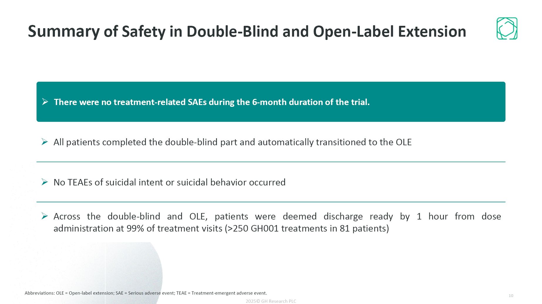 Abbreviations: OLE = Open-label extension; SAE = Serious adverse event; TEAE = Treatment-emergent adverse event.  Summary of Safety in Double-Blind and Open-Label Extension  2025© GH Research PLC  All patients completed the double-blind part and automatically transitioned to the OLE  No TEAEs of suicidal intent or suicidal behavior occurred  Across the double-blind and OLE, patients were deemed discharge ready by 1 hour from dose administration at 99% of treatment visits (>250 GH001 treatments in 81 patients)  There were no treatment-related SAEs during the 6-month duration of the trial.   10  All Rights Reserved