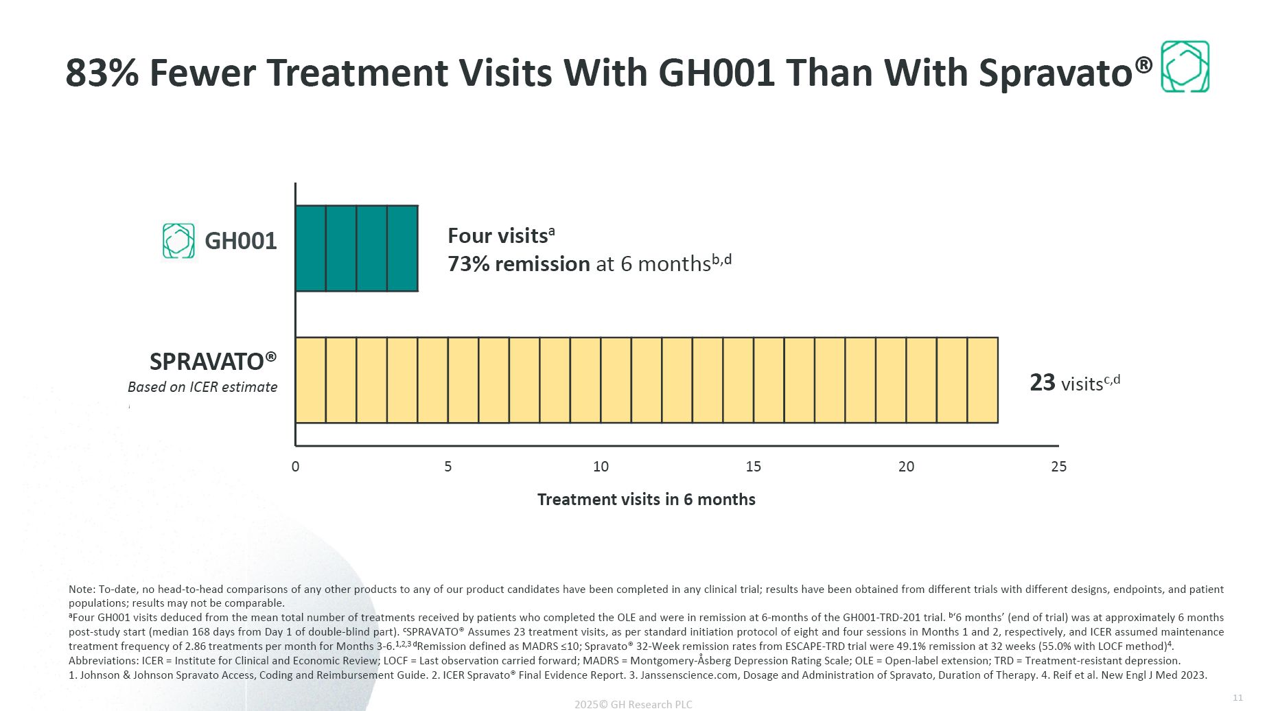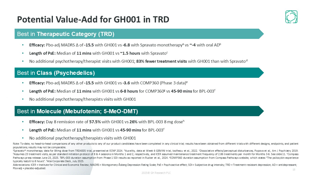Potential Value-Add for GH001 in TRD  Best in Therapeutic Category (TRD)  Efficacy: Pbo-adj MADRS Δ of -15.5 with GH001 vs -6.8 with Spravato monotherapya vs ~-4 with oral ADb  Length of PsE: Median of 11 mins with GH001 vs ~1.5 hours with Spravatoc  No additional psychotherapy/therapist visits with GH001; 83% fewer treatment visits with GH001 than with Spravatod  Best in Class (Psychedelics)  Efficacy: Pbo-adj MADRS Δ of -15.5 with GH001 vs -3.6 with COMP360 (Phase 3 data)e  Length of PsE: Median of 11 mins with GH001 vs 6-8 hours for COMP360g vs 45-90 mins for BPL-003f  No additional psychotherapy/therapists visits with GH001  Best in Molecule (Mebufotenin; 5-MeO-DMT)  Efficacy: Day 8 remission rate of 57.5% with GH001 vs 26% with BPL-003 8 mg doseh   Length of PsE: Median of 11 mins with GH001 vs 45-90 mins for BPL-003f  No additional psychotherapy/therapists visits with GH001  Note: To-date, no head-to-head comparisons of any other products to any of our product candidates have been completed in any clinical trial; results have been obtained from different trials with different designs, endpoints, and patient populations; results may not be comparable.  aSpravato® monotherapy data for 84mg dose from TRD4005 trial, presented at ECNP 2024. bAuvelity, data at Week 6 GEMINI trial, Iosifescu et al., 2022. cDissociative effects/perceptual disturbances, Popova et al., Am J Psychiatry 2019. dAssumes 23 treatment visits, as per standard initiation protocol of 8 & 4 sessions in Months 1 and 2, respectively, and ICER assumed maintenance treatment frequency of 2.86 treatments per month for Months 3-6. See slide 11. eCompass Pathways press release June 23, 2025. fBPL-003 duration assumption from Phase 1 SDI results as reported in Rucker et al., 2024. gCOMP360 duration assumption from Compass Pathways website, which states “The psilocybin experience typically lasts 6 to 8 hours”. hAtai Corporate Deck, July 2025.  Abbreviations: ICER = Institute for Clinical and Economic Review; MADRS = Montgomery-Åsberg Depression Rating Scale; PsE = Psychoactive effect; SDI = Subjective drug intensity; TRD = Treatment-resistant depression; AD = antidepressant;  Pbo-adj = placebo-adjusted.  13  2025© GH Research PLC