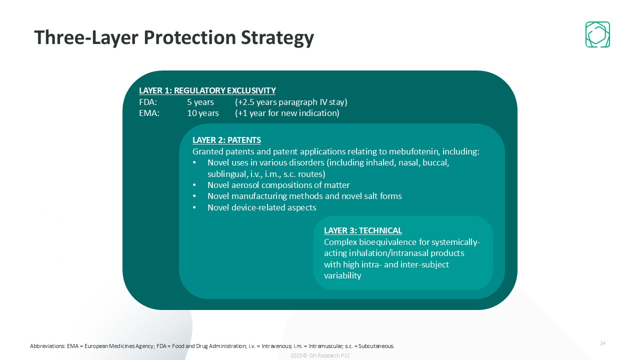 Three-Layer Protection Strategy  14  LAYER 1: REGULATORY EXCLUSIVITY  FDA: 5 years (+2.5 years paragraph IV stay)  EMA: 10 years (+1 year for new indication)  LAYER 2: PATENTS  Granted patents and patent applications relating to mebufotenin, including:   Novel uses in various disorders (including inhaled, nasal, buccal, sublingual, i.v., i.m., s.c. routes)   Novel aerosol compositions of matter  Novel manufacturing methods and novel salt forms   Novel device-related​ aspects  LAYER 3: TECHNICALComplex bioequivalence for systemically-acting inhalation/intranasal products with high intra- and inter-subject variability  Abbreviations: EMA = European Medicines Agency; FDA = Food and Drug Administration; i.v. = Intravenous; i.m. = Intramuscular; s.c. = Subcutaneous.  2025© GH Research PLC