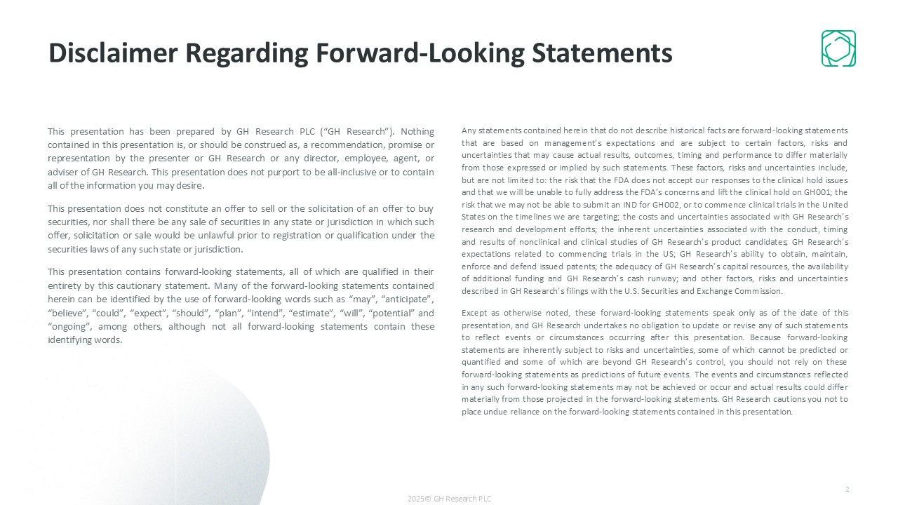 Any statements contained herein that do not describe historical facts are forward-looking statements that are based on management’s expectations and are subject to certain factors, risks and uncertainties that may cause actual results, outcomes, timing and performance to differ materially from those expressed or implied by such statements. These factors, risks and uncertainties include, but are not limited to: the risk that the FDA does not accept our responses to the clinical hold issues and that we will be unable to fully address the FDA’s concerns and lift the clinical hold on GH001; the risk that we may not be able to submit an IND for GH002, or to commence clinical trials in the United States on the timelines we are targeting; the costs and uncertainties associated with GH Research’s research and development efforts; the inherent uncertainties associated with the conduct, timing and results of nonclinical and clinical studies of GH Research’s product candidates; GH Research’s expectations related to commencing trials in the US; GH Research’s ability to obtain, maintain, enforce and defend issued patents; the adequacy of GH Research’s capital resources, the availability of additional funding and GH Research’s cash runway; and other factors, risks and uncertainties described in GH Research’s filings with the U.S. Securities and Exchange Commission.   Except as otherwise noted, these forward-looking statements speak only as of the date of this presentation, and GH Research undertakes no obligation to update or revise any of such statements to reflect events or circumstances occurring after this presentation. Because forward-looking statements are inherently subject to risks and uncertainties, some of which cannot be predicted or quantified and some of which are beyond GH Research’s control, you should not rely on these forward-looking statements as predictions of future events. The events and circumstances reflected in any such forward-looking statements may not be achieved or occur and actual results could differ materially from those projected in the forward-looking statements. GH Research cautions you not to place undue reliance on the forward-looking statements contained in this presentation.  This presentation has been prepared by GH Research PLC (“GH Research”). Nothing contained in this presentation is, or should be construed as, a recommendation, promise or representation by the presenter or GH Research or any director, employee, agent, or adviser of GH Research. This presentation does not purport to be all-inclusive or to contain all of the information you may desire.  This presentation does not constitute an offer to sell or the solicitation of an offer to buy securities, nor shall there be any sale of securities in any state or jurisdiction in which such offer, solicitation or sale would be unlawful prior to registration or qualification under the securities laws of any such state or jurisdiction.  This presentation contains forward-looking statements, all of which are qualified in their entirety by this cautionary statement. Many of the forward-looking statements contained herein can be identified by the use of forward-looking words such as “may”, “anticipate”, “believe”, “could”, “expect”, “should”, “plan”, “intend”, “estimate”, “will”, “potential” and “ongoing”, among others, although not all forward-looking statements contain these identifying words.  Disclaimer Regarding Forward-Looking Statements  2  2025© GH Research PLC