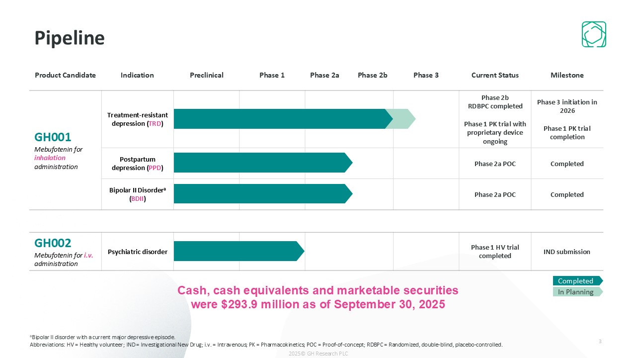 Product Candidate  Indication  Preclinical  Phase 1  Phase 2a Phase 2b  Phase 3  Current Status  Milestone  GH001  Mebufotenin for inhalation administration  Treatment-resistant depression (TRD)  Phase 2b RDBPC completed  Phase 1 PK trial with proprietary device ongoing  Phase 3 initiation in 2026   Phase 1 PK trial completion  Postpartum depression (PPD)  Phase 2a POC  Completed  Bipolar II Disordera (BDII)  Phase 2a POC  Completed  GH002  Mebufotenin for i.v. administration  Psychiatric disorder  Phase 1 HV trial completed  IND submission  Pipeline  3  aBipolar II disorder with a current major depressive episode.  Abbreviations: HV = Healthy volunteer; IND = Investigational New Drug; i.v. = Intravenous; PK = Pharmacokinetics; POC = Proof-of-concept; RDBPC = Randomized, double-blind, placebo-controlled.  2025© GH Research PLC  Cash, cash equivalents and marketable securities were $293.9 million as of September 30, 2025  Completed  In Planning