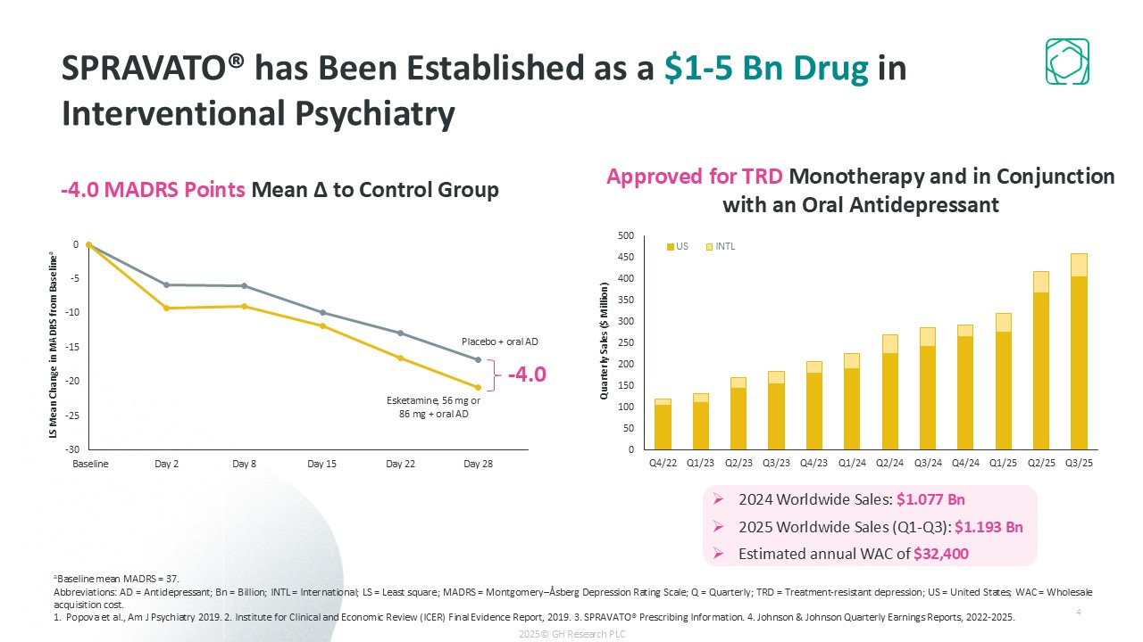 SPRAVATO® has Been Established as a $1-5 Bn Drug in Interventional Psychiatry  4  2024 Worldwide Sales: $1.077 Bn   2025 Worldwide Sales (Q1-Q3): $1.193 Bn   Estimated annual WAC of $32,400  -4.0  Approved for TRD Monotherapy and in Conjunction with an Oral Antidepressant  -4.0 MADRS Points Mean Δ to Control Group  aBaseline mean MADRS = 37.  Abbreviations: AD = Antidepressant; Bn = Billion; INTL = International; LS = Least square; MADRS = Montgomery–Åsberg Depression Rating Scale; Q = Quarterly; TRD = Treatment-resistant depression; US = United States; WAC = Wholesale acquisition cost.  1. Popova et al., Am J Psychiatry 2019. 2. Institute for Clinical and Economic Review (ICER) Final Evidence Report, 2019. 3. SPRAVATO® Prescribing Information. 4. Johnson & Johnson Quarterly Earnings Reports, 2022-2025.  Placebo + oral AD  Esketamine, 56 mg or 86 mg + oral AD  LS Mean Change in MADRS from Baselinea  2025© GH Research PLC  Quarterly Sales ($ Million)