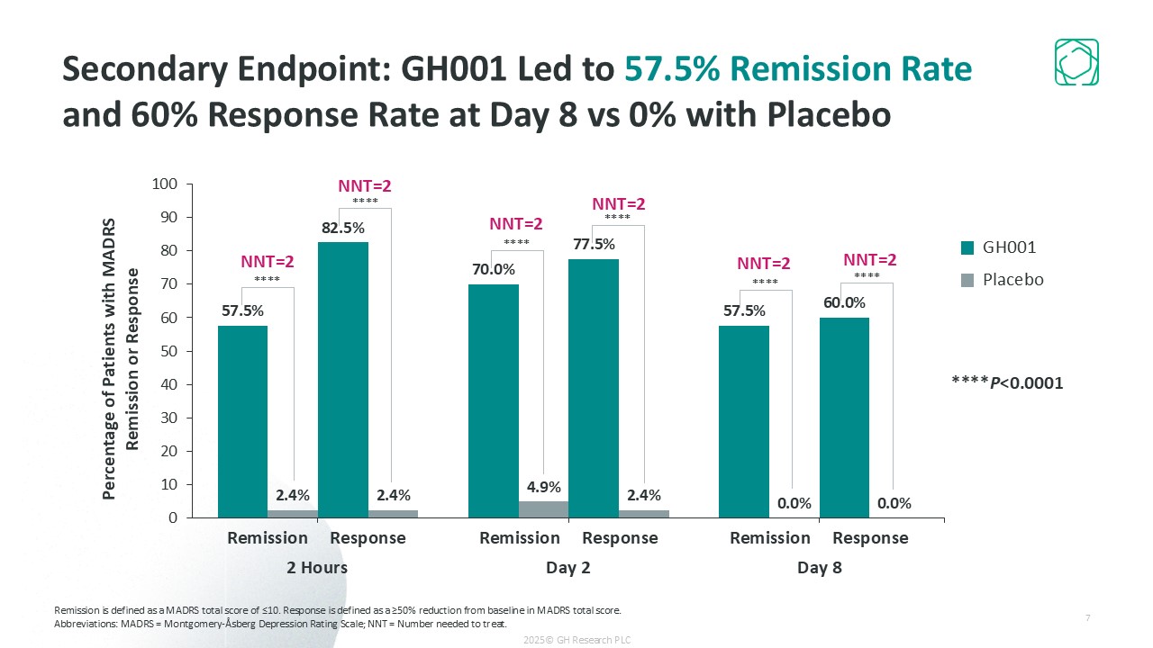 ****P<0.0001  2 Hours  Day 2  Day 8  Remission Response  GH001  Placebo  ****  ****  ****  ****  ****  ****  Remission Response  Remission Response  NNT=2  NNT=2  NNT=2  Remission is defined as a MADRS total score of ≤10. Response is defined as a ≥50% reduction from baseline in MADRS total score.  Abbreviations: MADRS = Montgomery-Åsberg Depression Rating Scale; NNT = Number needed to treat.   Secondary Endpoint: GH001 Led to 57.5% Remission Rate and 60% Response Rate at Day 8 vs 0% with Placebo  NNT=2  NNT=2  2025© GH Research PLC  7
