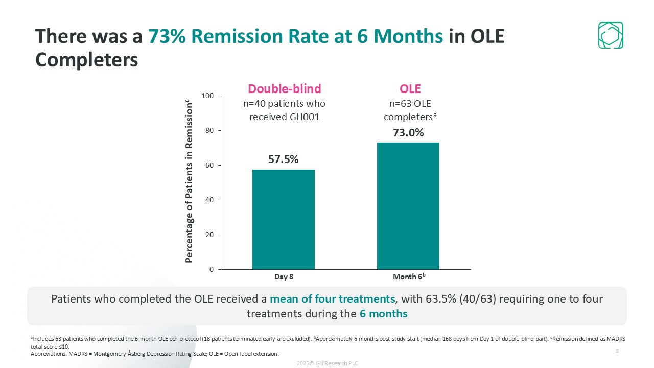 8  There was a 73% Remission Rate at 6 Months in OLE Completers  aIncludes 63 patients who completed the 6-month OLE per protocol (18 patients terminated early are excluded). bApproximately 6 months post-study start (median 168 days from Day 1 of double-blind part). cRemission defined as MADRS total score ≤10.   Abbreviations: MADRS = Montgomery-Åsberg Depression Rating Scale; OLE = Open-label extension.  Double-blind  n=40 patients who received GH001  OLE  n=63 OLE completersa  Day 8  Month 6b  Percentage of Patients in Remissionc  Patients who completed the OLE received a mean of four treatments, with 63.5% (40/63) requiring one to four treatments during the 6 months  2025© GH Research PLC