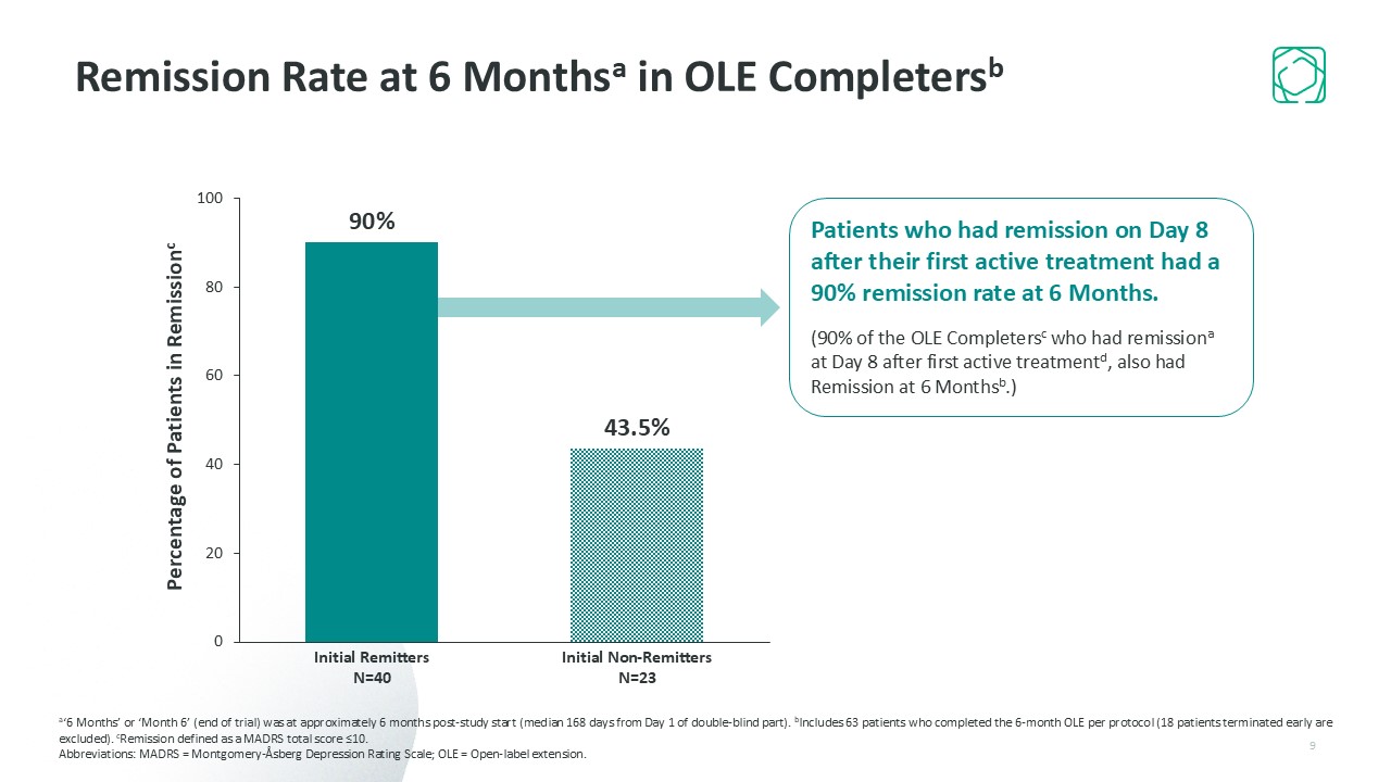 Initial Remitters  N=40  Initial Non-Remitters  N=23  Percentage of Patients in Remissionc  9  Remission Rate at 6 Monthsa in OLE Completersb  a‘6 Months’ or ‘Month 6’ (end of trial) was at approximately 6 months post-study start (median 168 days from Day 1 of double-blind part). bIncludes 63 patients who completed the 6-month OLE per protocol (18 patients terminated early are excluded). cRemission defined as a MADRS total score ≤10.   Abbreviations: MADRS = Montgomery-Åsberg Depression Rating Scale; OLE = Open-label extension.  Patients who had remission on Day 8 after their first active treatment had a 90% remission rate at 6 Months.  (90% of the OLE Completersc who had remissiona at Day 8 after first active treatmentd, also had Remission at 6 Monthsb.)