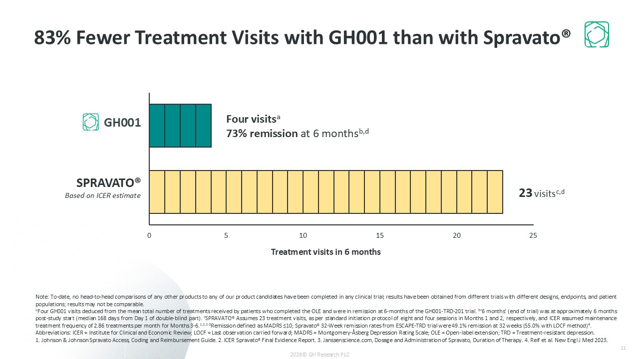 GH001  Treatment visits in 6 months  4 visitsa  23 visitsc,d  73.0% remission at 6 monthsb  83% Fewer Treatment Visits with GH001 than with Spravato®  Note: To-date, no head-to-head comparisons of any other products to any of our product candidates have been completed in any clinical trial; results have been obtained from different trials with different designs, endpoints, and patient populations; results may not be comparable.  aFour GH001 visits deduced from the mean total number of treatments received by patients who completed the OLE and were in remission at 6-months of the GH001-TRD-201 trial. b‘6 months’ (end of trial) was at approximately 6 months post-study start (median 168 days from Day 1 of double-blind part). cSPRAVATO® Assumes 23 treatment visits, as per standard initiation protocol of eight and four sessions in Months 1 and 2, respectively, and ICER assumed maintenance treatment frequency of 2.86 treatments per month for Months 3-6.1,2,3 dRemission defined as MADRS ≤10; Spravato® 32-Week remission rates from ESCAPE-TRD trial were 49.1% remission at 32 weeks (55.0% with LOCF method)4.  Abbreviations: ICER = Institute for Clinical and Economic Review; LOCF = Last observation carried forward; MADRS = Montgomery-Åsberg Depression Rating Scale; OLE = Open-label extension; TRD = Treatment-resistant depression.  1. Johnson & Johnson Spravato Access, Coding and Reimbursement Guide. 2. ICER Spravato® Final Evidence Report. 3. Janssenscience.com, Dosage and Administration of Spravato, Duration of Therapy. 4. Reif et al. New Engl J Med 2023.  Four visitsa  73% remission at 6 monthsb,d  2026© GH Research PLC  SPRAVATO®  Based on ICER estimate  11
