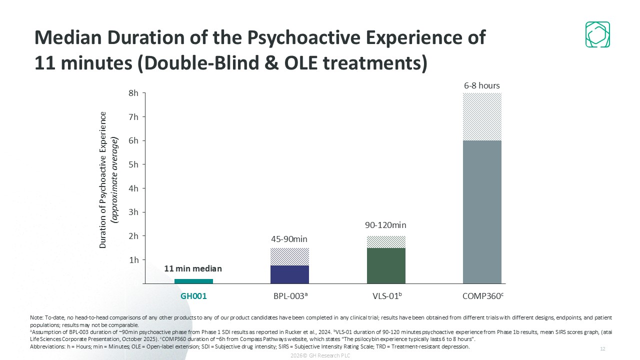 Median Duration of the Psychoactive Experience of 11 minutes (Double-Blind & OLE treatments)   Note: To-date, no head-to-head comparisons of any other products to any of our product candidates have been completed in any clinical trial; results have been obtained from different trials with different designs, endpoints, and patient populations; results may not be comparable.  aAssumption of BPL-003 duration of ~90min psychoactive phase from Phase 1 SDI results as reported in Rucker et al., 2024. bVLS-01 duration of 90-120 minutes psychoactive experience from Phase 1b results, mean SIRS scores graph, (atai Life Sciences Corporate Presentation, October 2025). cCOMP360 duration of ~6h from Compass Pathways website, which states “The psilocybin experience typically lasts 6 to 8 hours”.  Abbreviations: h = Hours; min = Minutes; OLE = Open-label extension; SDI = Subjective drug intensity; SIRS = Subjective Intensity Rating Scale; TRD = Treatment-resistant depression.   12  2026© GH Research PLC  GH001  2h  3h  4h  5h  6h  BPL-003a  VLS-01b  COMP360c  11 min median  1h  Duration of Psychoactive Experience (approximate average)  45-90min  90-120min  6-8 hours  7h  8h