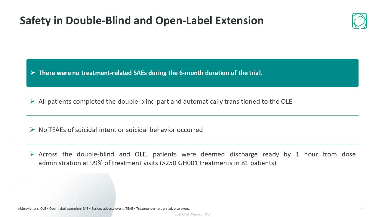 Abbreviations: OLE = Open-label extension; SAE = Serious adverse event; TEAE = Treatment-emergent adverse event.  Safety in Double-Blind and Open-Label Extension  2026© GH Research PLC  All patients completed the double-blind part and automatically transitioned to the OLE  No TEAEs of suicidal intent or suicidal behavior occurred  Across the double-blind and OLE, patients were deemed discharge ready by 1 hour from dose administration at 99% of treatment visits (>250 GH001 treatments in 81 patients)  There were no treatment-related SAEs during the 6-month duration of the trial.   13
