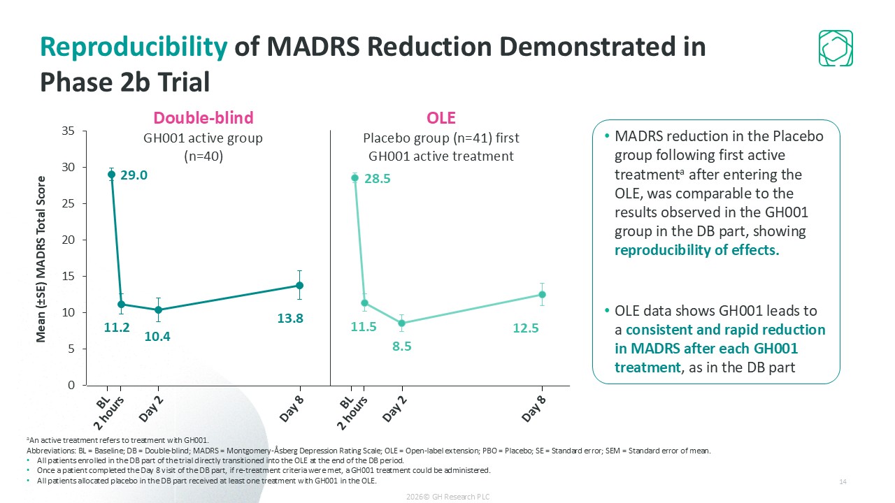 MADRS reduction in the Placebo group following first active treatmenta after entering the OLE, was comparable to the results observed in the GH001 group in the DB part, showing reproducibility of effects.  OLE data shows GH001 leads to a consistent and rapid reduction in MADRS after each GH001 treatment, as in the DB part  Double-blind GH001 active group (n=40)  OLE  Placebo group (n=41) first GH001 active treatment  Mean (±SE) MADRS Total Score  BL  2 hours  Day 2  Day 8  BL  2 hours  Day 2  Day 8  Reproducibility of MADRS Reduction Demonstrated in   Phase 2b Trial  aAn active treatment refers to treatment with GH001.  Abbreviations: BL = Baseline; DB = Double-blind; MADRS = Montgomery-Åsberg Depression Rating Scale; OLE = Open-label extension; PBO = Placebo; SE = Standard error; SEM = Standard error of mean.  All patients enrolled in the DB part of the trial directly transitioned into the OLE at the end of the DB period.  Once a patient completed the Day 8 visit of the DB part, if re-treatment criteria were met, a GH001 treatment could be administered.  All patients allocated placebo in the DB part received at least one treatment with GH001 in the OLE.   14  2026© GH Research PLC