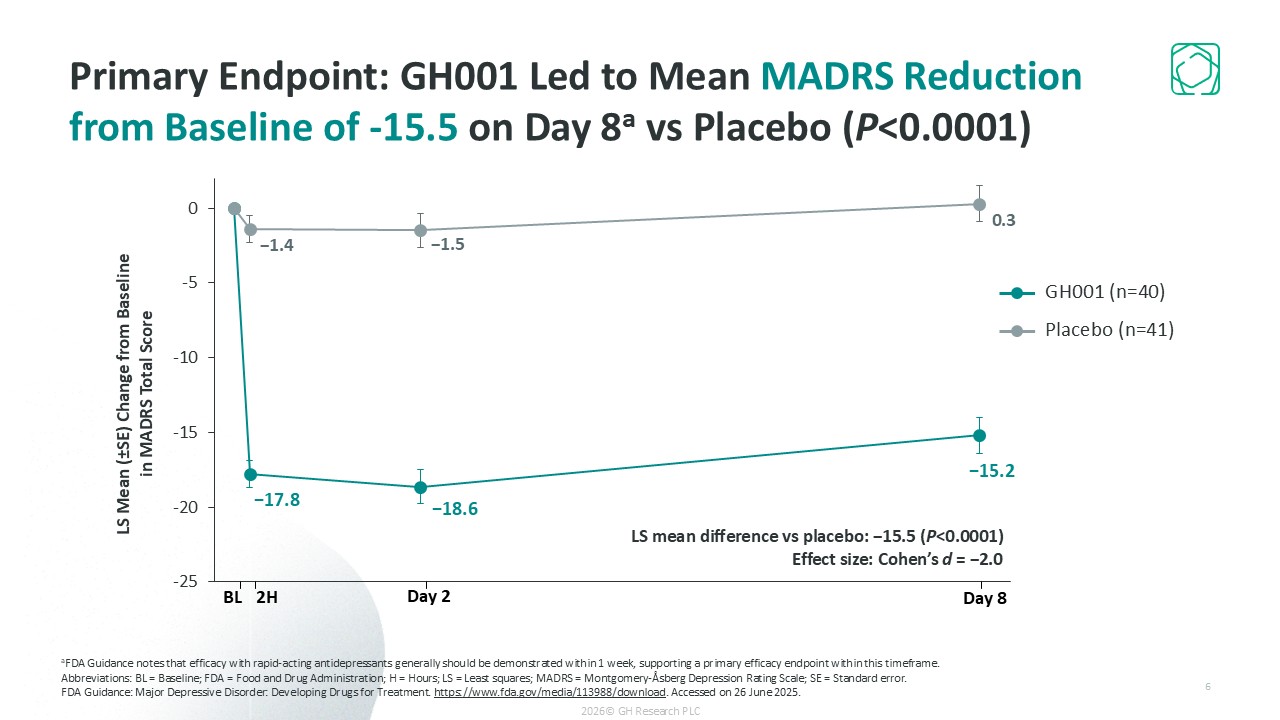 Primary Endpoint: GH001 Led to Mean MADRS Reduction from Baseline of -15.5 on Day 8a vs Placebo (P<0.0001)  aFDA Guidance notes that efficacy with rapid-acting antidepressants generally should be demonstrated within 1 week, supporting a primary efficacy endpoint within this timeframe.  Abbreviations: BL = Baseline; FDA = Food and Drug Administration; H = Hours; LS = Least squares; MADRS = Montgomery-Åsberg Depression Rating Scale; SE = Standard error.  FDA Guidance: Major Depressive Disorder: Developing Drugs for Treatment. https://www.fda.gov/media/113988/download. Accessed on 26 June 2025.  LS mean difference vs placebo: −15.5 (P<0.0001)  Effect size: Cohen’s d = −2.0  LS Mean (±SE) Change from Baseline in MADRS Total Score  BL  2H  Day 2  Day 8  GH001 (n=40)  Placebo (n=41)  2026© GH Research PLC  6