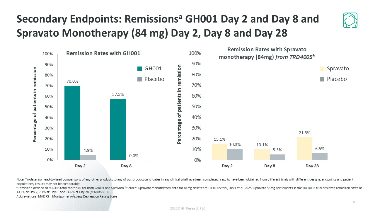 GH001 vs Placebo  Spravato  Mono  Spravato  +AD  Spravato  Mono  Spravato + AD vs Placebo + AD from TRANSFORM-2a  Spravato monotherapy (84mg) vs Placebo from TRD4005b  Spravato  +AD  Not reported  Key Secondary Endpoint  MADRS Total Score Change from Baseline: GH001 and Spravato at Day 2 and Primary Endpoint (Difference from Comparator Arm)  7  Note: To-date, no head-to-head comparisons of any other products to any of our product candidates in any clinical trial have been completed; results have been obtained from different trials with different designs, endpoints and patient populations; results may not be comparable.  aSpravato + AD data from TRANSFORM-2, Popova et al., 2019; bSpravato monotherapy data for 84mg dose from TRD4005 trial, Janik et al., 2025; Spravato 56mg MADRS total score change from baseline difference of LS means from PBO was -5.1 at Day 28 and -3.8 at Day 2  Abbreviations: AD = Antidepressant; BL = Baseline; D = Day; LS = Least Squares; MADRS = Montgomery-Åsberg Depression Rating Scale; Mono = Monotherapy.  2026© GH Research PLC