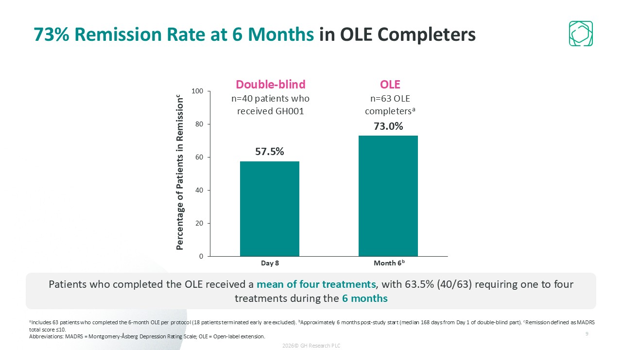 Initial Remitters  n=40  Initial Non-Remitters  n=23  Percentage of Patients in Remissionc  10  Remission Rate at 6 Monthsa in OLE Completersb  a‘6 Months’ or ‘Month 6’ (end of trial) was at approximately 6 months post-study start (median 168 days from Day 1 of double-blind part). bIncludes 63 patients who completed the 6-month OLE per protocol (18 patients terminated early are excluded). cRemission defined as a MADRS total score ≤10.   Abbreviations: MADRS = Montgomery-Åsberg Depression Rating Scale; OLE = Open-label extension.  2026© GH Research PLC  Patients in remission on Day 8 after their first active treatment had a 90% remission rate at 6 Months.  43.5% of the patients not in remission on Day 8 after first active treatment were in remission at 6 Months.