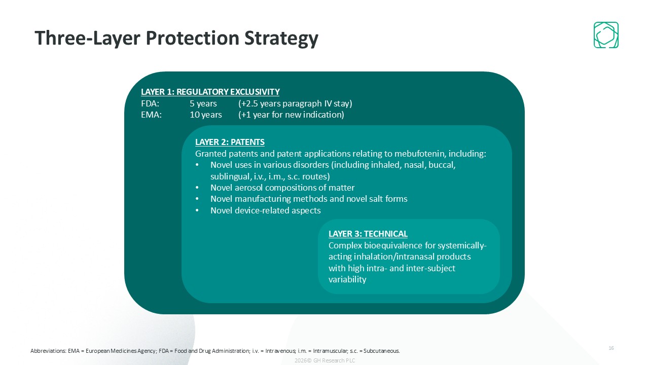 Three-Layer Protection Strategy  16  LAYER 1: REGULATORY EXCLUSIVITY  FDA: 5 years (+2.5 years paragraph IV stay)  EMA: 10 years (+1 year for new indication)  LAYER 2: PATENTS  Granted patents and patent applications relating to mebufotenin, including:   Novel uses in various disorders (including inhaled, nasal, buccal, sublingual, i.v., i.m., s.c. routes)   Novel aerosol compositions of matter  Novel manufacturing methods and novel salt forms   Novel device-related​ aspects  LAYER 3: TECHNICALComplex bioequivalence for systemically-acting inhalation/intranasal products with high intra- and inter-subject variability  Abbreviations: EMA = European Medicines Agency; FDA = Food and Drug Administration; i.v. = Intravenous; i.m. = Intramuscular; s.c. = Subcutaneous.  2026© GH Research PLC