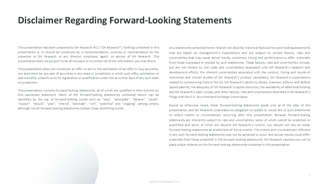 Any statements contained herein that do not describe historical facts are forward-looking statements that are based on management’s expectations and are subject to certain factors, risks and uncertainties that may cause actual results, outcomes, timing and performance to differ materially from those expressed or implied by such statements. These factors, risks and uncertainties include, but are not limited to: the costs and uncertainties associated with GH Research’s research and development efforts; the inherent uncertainties associated with the conduct, timing and results of nonclinical and clinical studies of GH Research’s product candidates; GH Research’s expectations related to commencing trials in the US; GH Research’s ability to obtain, maintain, enforce and defend issued patents; the adequacy of GH Research’s capital resources, the availability of additional funding and GH Research’s cash runway; and other factors, risks and uncertainties described in GH Research’s filings with the U.S. Securities and Exchange Commission.   Except as otherwise noted, these forward-looking statements speak only as of the date of this presentation, and GH Research undertakes no obligation to update or revise any of such statements to reflect events or circumstances occurring after this presentation. Because forward-looking statements are inherently subject to risks and uncertainties, some of which cannot be predicted or quantified and some of which are beyond GH Research’s control, you should not rely on these forward-looking statements as predictions of future events. The events and circumstances reflected in any such forward-looking statements may not be achieved or occur and actual results could differ materially from those projected in the forward-looking statements. GH Research cautions you not to place undue reliance on the forward-looking statements contained in this presentation.  This presentation has been prepared by GH Research PLC (“GH Research”). Nothing contained in this presentation is, or should be construed as, a recommendation, promise or representation by the presenter or GH Research or any director, employee, agent, or adviser of GH Research. This presentation does not purport to be all-inclusive or to contain all of the information you may desire.  This presentation does not constitute an offer to sell or the solicitation of an offer to buy securities, nor shall there be any sale of securities in any state or jurisdiction in which such offer, solicitation or sale would be unlawful prior to registration or qualification under the securities laws of any such state or jurisdiction.  This presentation contains forward-looking statements, all of which are qualified in their entirety by this cautionary statement. Many of the forward-looking statements contained herein can be identified by the use of forward-looking words such as “may”, “anticipate”, “believe”, “could”, “expect”, “should”, “plan”, “intend”, “estimate”, “will”, “potential” and “ongoing”, among others, although not all forward-looking statements contain these identifying words.  Disclaimer Regarding Forward-Looking Statements  2  2026© GH Research PLC