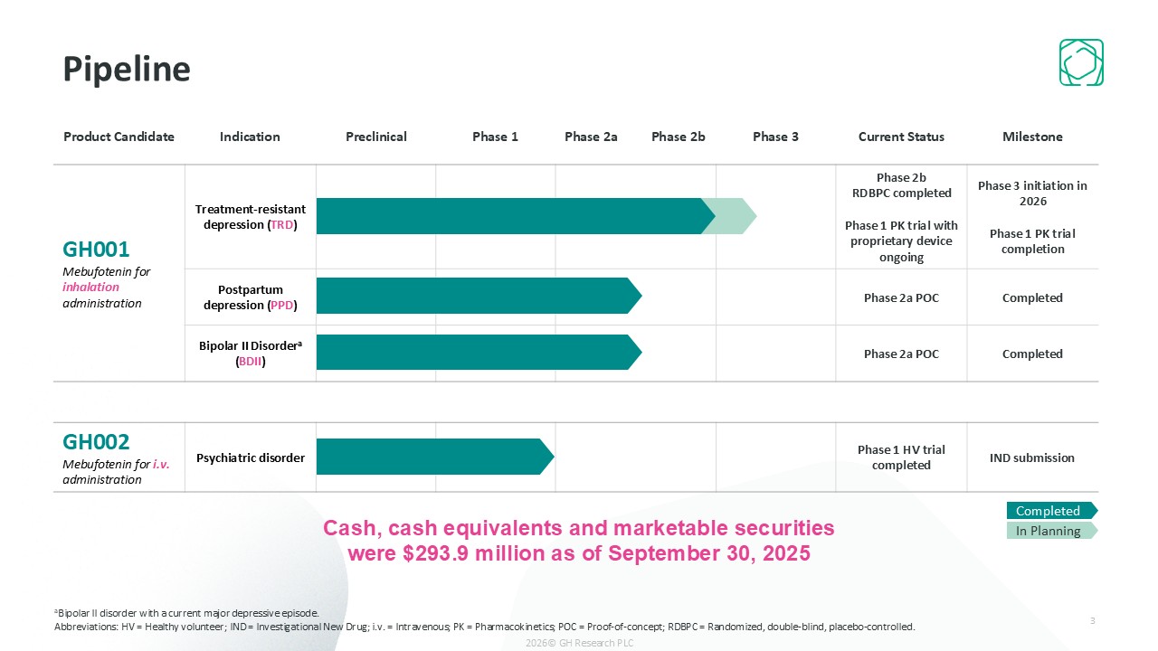 Product Candidate  Indication  Preclinical  Phase 1  Phase 2a Phase 2b  Phase 3  Current Status  Milestone  GH001  Mebufotenin for inhalation administration  Treatment-resistant depression (TRD)  Phase 2b RDBPC completed  Phase 1 PK trial with proprietary device ongoing  Phase 3 initiation in 2026   Phase 1 PK trial completion  Postpartum depression (PPD)  Phase 2a POC  Completed  Bipolar II Disordera (BDII)  Phase 2a POC  Completed  GH002  Mebufotenin for i.v. administration  Psychiatric disorder  Phase 1 HV trial completed  IND submission  Pipeline  3  aBipolar II disorder with a current major depressive episode.  Abbreviations: HV = Healthy volunteer; IND = Investigational New Drug; i.v. = Intravenous; PK = Pharmacokinetics; POC = Proof-of-concept; RDBPC = Randomized, double-blind, placebo-controlled.  2026© GH Research PLC  Cash, cash equivalents and marketable securities were $293.9 million as of September 30, 2025  Completed  In Planning