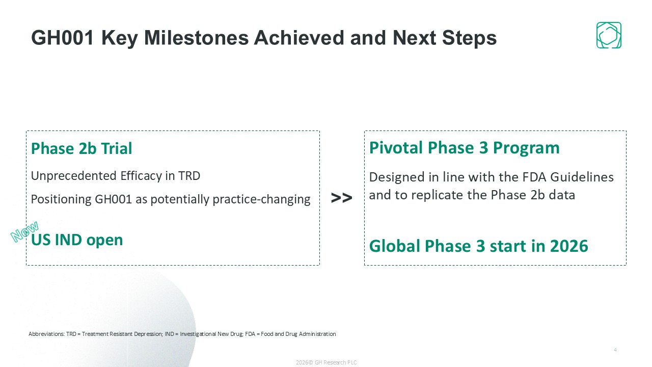 New  Phase 2b trial   Unprecedented Efficacy in TRD  Positioning GH001 as potentially Practice-Changing   US IND open   GH001 Key Milestones Achieved and Next Steps  Pivotal Phase 3 Program   Designed in line with the FDA Guidelines and to replicate the Phase 2b data  Global Phase 3 start in 2026  17  >>  Abbreviations: TRD = Treatment Resistant Depression; IND = Investigational New Drug; FDA = Food and Drug Administration  2026© GH Research PLC