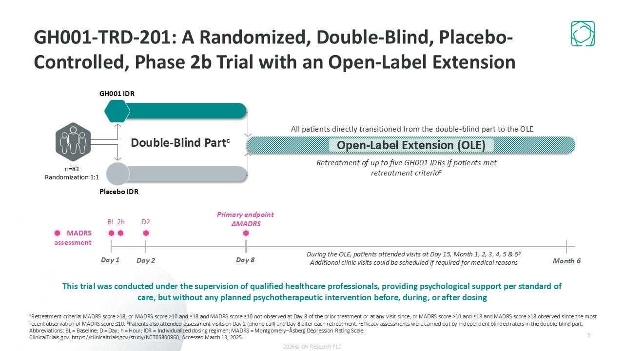 5  Retreatment of up to five GH001 IDRs if patients met retreatment criteriaa  Open-Label Extension (OLE)  n=81  Randomization 1:1  GH001 IDR  Placebo IDR   BL  2h  Day 1  Primary endpoint   ΔMADRS  Day 8  During the OLE, patients attended visits at Day 15, Month 1, 2, 3, 4, 5 & 6b  Additional clinic visits could be scheduled if required for medical reasons  MADRS  assessment  Month 6  D2  Day 2  Double-Blind Partc  This trial was conducted under the supervision of qualified healthcare professionals, providing psychological support per standard of care, but without any planned psychotherapeutic intervention before, during, or after dosing  All patients directly transitioned from the double-blind part to the OLE  GH001-TRD-201: A Randomized, Double-Blind, Placebo-Controlled, Phase 2b Trial with an Open-Label Extension  aRetreatment criteria: MADRS score >18, or MADRS score >10 and ≤18 and MADRS score ≤10 not observed at Day 8 of the prior treatment or at any visit since, or MADRS score >10 and ≤18 and MADRS score >18 observed since the most recent observation of MADRS score ≤10. bPatients also attended assessment visits on Day 2 (phone call) and Day 8 after each retreatment. cEfficacy assessments were carried out by independent blinded raters in the double-blind part.  Abbreviations: BL = Baseline; D = Day; h = Hour; IDR = Individualized dosing regimen; MADRS = Montgomery–Åsberg Depression Rating Scale.   ClinicalTrials.gov. https://clinicaltrials.gov/study/NCT05800860, Accessed March 13, 2025.   2026© GH Research PLC