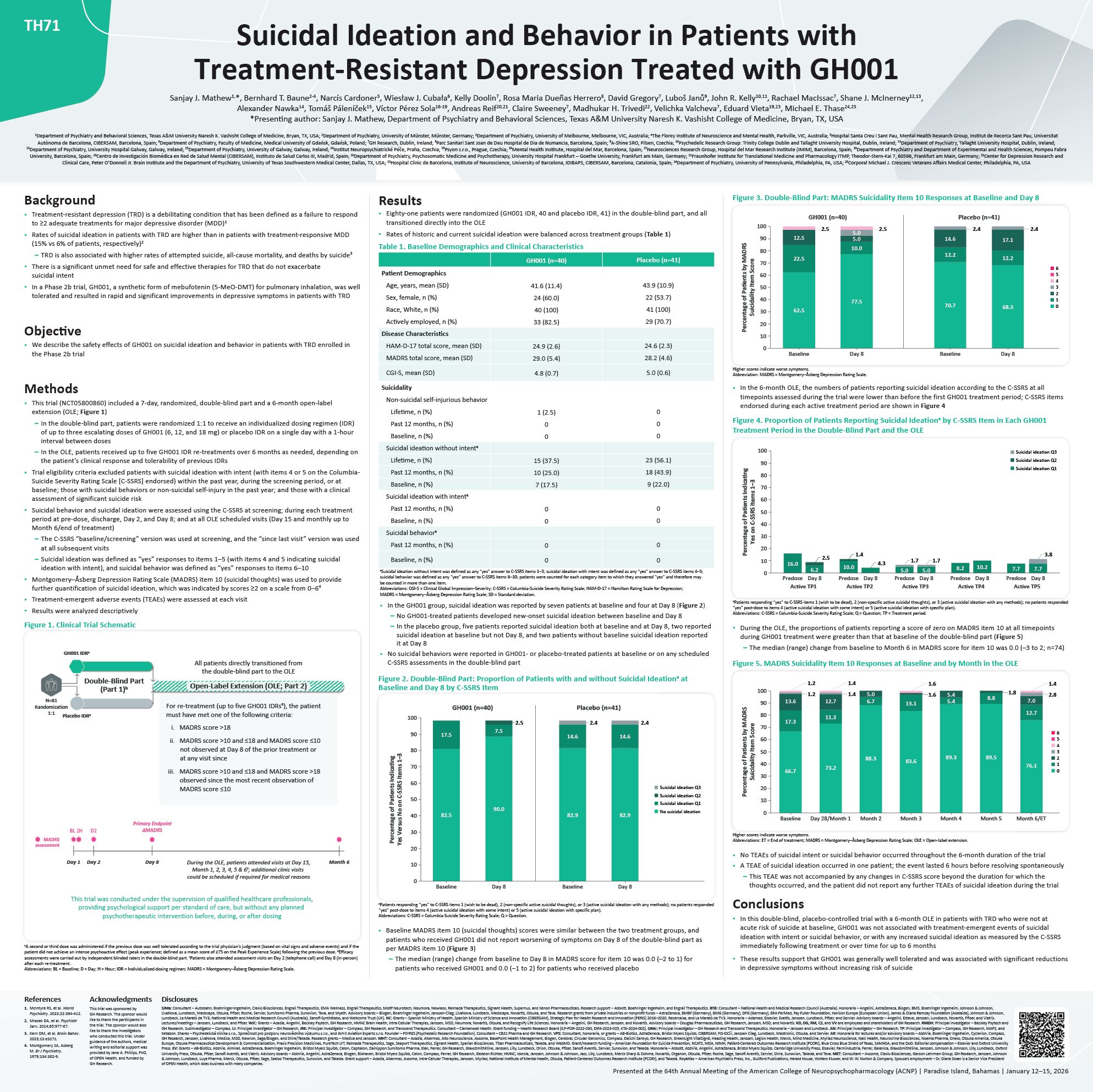 62.5  77.5  70.7  68.3  22.5  10.0  12.2  12.2  12.5  5.0  5.0  14.6  17.1  Figure 3. Double-Blind Part: MADRS Suicidality Item 10 Responses at Baseline and Day 8  GH001 (n=40) Placebo (n=41)  6  5  4  3  2  1  0  100  90  80  70  60  50  40  30  20  10  0  Baseline Day 8  Baseline  Day 8  Percentage of Patients by MADRS Suicidality Item Score  2.5 2.5  2.4 2.4  Higher scores indicate worse symptoms.  Abbreviation: MADRS = Montgomery–Åsberg Depression Rating Scale.  In the 6-month OLE, the numbers of patients reporting suicidal ideation according to the C-SSRS at all timepoints assessed during the trial were lower than before the first GH001 treatment period; C-SSRS items endorsed during each active treatment period are shown in Figure 4  Figure 4. Proportion of Patients Reporting Suicidal Ideationa by C-SSRS Item in Each GH001 Treatment Period in the Double-Blind Part and the OLE  8.2  10.2  16.0  6.2  2.5  10.0  4.3  1.4  7.7  7.7  100  90  80  70  60  50  40  30  20  10  0  Predose Day 8  Active TP1  Predose Day 8  Active TP2  5.0 5.0  Predose Day 8  Active TP3  Predose Day 8  Active TP4  Predose Day 8  Active TP5  Percentage of Patients Indicating Yes on C-SSRS Items 1–3  1.7 1.7  3.8  Suicidal ideation Q3 Suicidal ideation Q2 Suicidal ideation Q1  aPatients responding “yes” to C-SSRS items 1 (wish to be dead), 2 (non-specific active suicidal thoughts), or 3 (active suicidal ideation with any methods); no patients responded “yes” post-dose to items 4 (active suicidal ideation with some intent) or 5 (active suicidal ideation with specific plan).  Abbreviations: C-SSRS = Columbia-Suicide Severity Rating Scale; Q = Question; TP = Treatment period.  During the OLE, the proportions of patients reporting a score of zero on MADRS item 10 at all timepoints during GH001 treatment were greater than that at baseline of the double-blind part (Figure 5)  – The median (range) change from baseline to Month 6 in MADRS score for item 10 was 0.0 (–3 to 2; n=74)  Figure 5. MADRS Suicidality Item 10 Responses at Baseline and by Month in the OLE  6  5  4  3  2  1  0  66.7  73.2  88.3  83.6  89.3  89.5  76.1  17.3  11.3  6.7  13.1  5.4  8.8  12.7  13.6  12.7  7.0  1.2  1.2  1.4  1.4 5.0  1.6  1.6 5.4  1.4  2.8  1.8  100  90  80  70  60  50  40  30  20  10  0  Month 5  Month 6/ET  Baseline Day 28/Month 1 Month 2 Month 3 Month 4  Percentage of Patients by MADRS Suicidality Item Score  Higher scores indicate worse symptoms.  Abbreviations: ET = End of treatment; MADRS = Montgomery–Åsberg Depression Rating Scale; OLE = Open-label extension.  No TEAEs of suicidal intent or suicidal behavior occurred throughout the 6-month duration of the trial  A TEAE of suicidal ideation occurred in one patient; the event lasted 6 hours before resolving spontaneously  – This TEAE was not accompanied by any changes in C-SSRS score beyond the duration for which the thoughts occurred, and the patient did not report any further TEAEs of suicidal ideation during the trial  Conclusions  In this double-blind, placebo-controlled trial with a 6-month OLE in patients with TRD who were not at acute risk of suicide at baseline, GH001 was not associated with treatment-emergent events of suicidal ideation with intent or suicidal behavior, or with any increased suicidal ideation as measured by the C-SSRS immediately following treatment or over time for up to 6 months  These results support that GH001 was generally well tolerated and was associated with significant reductions in depressive symptoms without increasing risk of suicide  •  Treatment-resistant depression (TRD) is a debilitating condition that has been defined as a failure to respond to ≥2 adequate treatments for major depressive disorder (MDD)1  Rates of suicidal ideation in patients with TRD are higher than in patients with treatment-responsive MDD (15% vs 6% of patients, respectively)2  – TRD is also associated with higher rates of attempted suicide, all-cause mortality, and deaths by suicide3  There is a significant unmet need for safe and effective therapies for TRD that do not exacerbate suicidal intent  In a Phase 2b trial, GH001, a synthetic form of mebufotenin (5-MeO-DMT) for pulmonary inhalation, was well tolerated and resulted in rapid and significant improvements in depressive symptoms in patients with TRD  Objective  We describe the safety effects of GH001 on suicidal ideation and behavior in patients with TRD enrolled in the Phase 2b trial  Methods  •  This trial (NCT05800860) included a 7-day, randomized, double-blind part and a 6-month open-label extension (OLE; Figure 1)  In the double-blind part, patients were randomized 1:1 to receive an individualized dosing regimen (IDR) of up to three escalating doses of GH001 (6, 12, and 18 mg) or placebo IDR on a single day with a 1-hour interval between doses  In the OLE, patients received up to five GH001 IDR re-treatments over 6 months as needed, depending on the patient’s clinical response and tolerability of previous IDRs  Trial eligibility criteria excluded patients with suicidal ideation with intent (with items 4 or 5 on the Columbia- Suicide Severity Rating Scale [C-SSRS] endorsed) within the past year, during the screening period, or at baseline; those with suicidal behaviors or non-suicidal self-injury in the past year; and those with a clinical assessment of significant suicide risk  Suicidal behavior and suicidal ideation were assessed using the C-SSRS at screening; during each treatment period at pre-dose, discharge, Day 2, and Day 8; and at all OLE scheduled visits (Day 15 and monthly up to Month 6/end of treatment)  The C-SSRS “baseline/screening” version was used at s