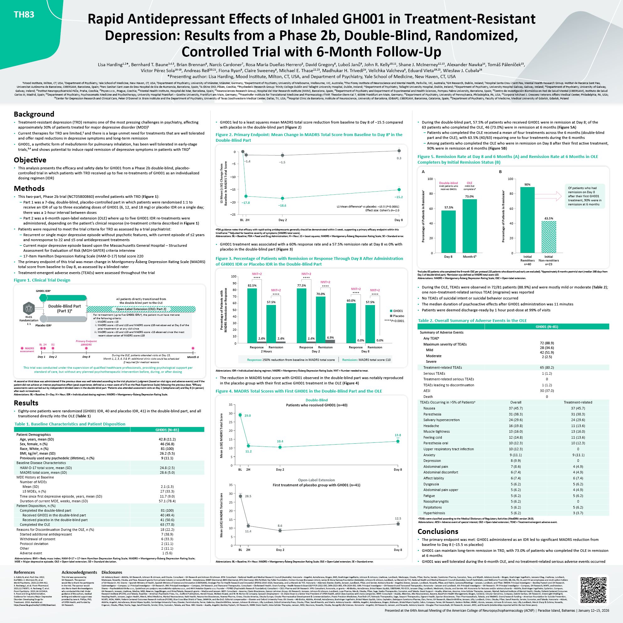Presented at the 64th Annual Meeting of the American College of Neuropsychopharmacology (ACNP) | Paradise Island, Bahamas | January 12–15, 2026  1Mood Institute, Milton, CT, USA; 2Department of Psychiatry, Yale School of Medicine, New Haven, CT, USA; 3Department of Psychiatry, University of Münster, Münster, Germany; 4Department of Psychiatry, University of Melbourne, Melbourne, VIC, Australia; 5The Florey Institute of Neuroscience and Mental Health, Parkville, VIC, Australia; 6GH Research, Dublin, Ireland; 7Hospital Santa Creu i Sant Pau, Mental Health Research Group, Institut de Recerca Sant Pau, Universitat Autònoma de Barcelona, CIBERSAM, Barcelona, Spain; 8Parc Sanitari Sant Joan de Deu Hospital de Dia de Numancia, Barcelona, Spain; 9A-Shine SRO, Pilsen, Czechia; 10Psychedelic Research Group: Trinity College Dublin and Tallaght University Hospital, Dublin, Ireland; 11Department of Psychiatry, Tallaght University Hospital, Dublin, Ireland; 12Department of Psychiatry, University Hospital Galway, Galway, Ireland; 13Department of Psychiatry, University of Galway, Galway, Ireland; 14Institut Neuropsychiatrické Péče, Praha, Czechia; 15Psyon s.r.o., Prague, Czechia; 16Mental Health Institute, Hospital del Mar, Barcelona, Spain; 17Neurosciences Research Group, Hospital del Mar Research Institute (IMIM), Barcelona, Spain; 18Department of Psychiatry and Department of Experimental and Health Sciences, Pompeu Fabra University, Barcelona, Spain; 19Centro de Investigación Biomédica en Red de Salud Mental (CIBERSAM), Instituto de Salud Carlos III, Madrid, Spain; 20Department of Psychiatry, Psychosomatic Medicine and Psychotherapy, University Hospital Frankfurt – Goethe University, Frankfurt am Main, Germany; 21Fraunhofer Institute for Translational Medicine and Pharmacology ITMP, Theodor-Stern-Kai 7, 60596 Frankfurt am Main, Germany; 22Department of Psychiatry, University of Pennsylvania, Philadelphia, PA, USA; 23Corporal Michael J. Crescenz Veterans Affairs Medical Center, Philadelphia, PA, USA;  24Center for Depression Research and Clinical Care, Peter O’Donnell Jr. Brain Institute and the Department of Psychiatry, University of Texas Southwestern Medical Center, Dallas, TX, USA; 25Hospital Clinic de Barcelona, Institute of Neuroscience, University of Barcelona, IDIBAPS, CIBERSAM, Barcelona, Catalonia, Spain; 26Department of Psychiatry, Faculty of Medicine, Medical University of Gdańsk, Gdańsk, Poland  Rapid Antidepressant Effects of Inhaled GH001 in Treatment-Resistant Depression: Results from a Phase 2b, Double-Blind, Randomized, Controlled Trial with 6-Month Follow-Up  Lisa Harding1,2*, Bernhard T. Baune3,4,5, Brian Brennan6, Narcís Cardoner7, Rosa Maria Dueñas Herrero8, David Gregory6, Luboš Janů9, John R. Kelly10,11, Shane J. McInerney12,13, Alexander Nawka14, Tomáš Páleníček15, Víctor Pérez Sola16-19, Andreas Reif20,21, Fiona Ryan6, Claire Sweeney6, Michael E. Thase22,23, Madhukar H. Trivedi24, Velichka Valcheva6, Eduard Vieta19,25, Wiesław J. Cubała26  *Presenting author: Lisa Harding, Mood Institute, Milton, CT, USA, and Department of Psychiatry, Yale School of Medicine, New Haven, CT, USA  References  1. Kubitz N, et al. PLoS One. 2013; 8:e76882. 2. McIntyre RS, et al. World Psychiatry. 2023;22:394-412.  3. Reckweg J, et al. Front Pharmacol. 2021;12:760671. 4. Reckweg JT, et al.  Front Psychiatry. 2023;14:1133414.  5. Food and Drug Administration. Guidance for Industry Major Depressive Disorder: Developing Drugs for Treatment. 2018. Available at:  https://www.fda.gov/media/113988/download.  Acknowledgments  This trial was sponsored by GH Research. The sponsor  would like to thank the participants in the trial. The sponsor would  also like to thank the investigators who conducted this trial. Under guidance of the authors, medical writing and editorial support was provided by Jane A. Phillips, PhD, of OPEN Health, and funded by GH Research.  Disclosures  LH: Advisory Board – AbbVie, GH Research, Johnson & Johnson, and Otsuka. Consultant – GH Research and Johnson & Johnson. BTB: Consultant – National Health and Medical Research Council (Australia). Honoraria – Angelini, AstraZeneca, Biogen, BMS, Boehringer Ingelheim, Johnson & Johnson, LivaNova, Lundbeck, Medscape, Otsuka, Pfizer, Roche, Servier, Sumitomo Pharma, Sunovion, Teva, and Wyeth. Advisory boards – Biogen, Boehringer Ingelheim, Janssen-Cilag, LivaNova, Lundbeck, Medscape, Novartis, Otsuka, and Teva. Research grants from private industry or nonprofit funds – AstraZeneca, BMBF (Germany), BMG (Germany), DFG (Germany), ERA PerMed, Fay Fuller Foundation, Horizon Europe (European Union), James & Diana Ramsay Foundation (Adelaide), Johnson & Johnson, Lundbeck, La Marató de TV3, National Health and Medical Research Council (Australia), Sanofi-Synthélabo, and Wellcome Trust (UK). BB, DG, FR, CS, and VV are employees and stock option holders of GH Research. NC: Grants – Spanish Ministry of Health, Spanish Ministry of Science and Innovation (CIBERSAM), Strategic Plan for Health Research and Innovation (PERIS) 2016–2020, Recercaixa, and La Marató de TV3. Honoraria – Adamed, Elsevier, Exeltis, Janssen, Lundbeck, Pfizer, and Servier. Advisory Boards – Angelini, Esteve, Janssen, Lundbeck, Novartis, Pfizer, and Viatris. Lectures/Meetings – Janssen, Lundbeck, and Pfizer. RMDH: Principal investigator – Beckley Psytech and GH Research.  Subinvestigator – Compass. LJ: Principal investigator – GH Research. JRK: Principal investigator – Compass, GH Research, and Transcend Therapeutics. Consultant – Clerkenwell Health. Grant funding – Health Research Board (ILP-POR-2022-030, DIFA-2023-005, KTA-2024-002. SJM: Principal investigator – GH Research and Transcend Therapeutics. Honoraria – Janssen and Lundbeck. AN: Principal investigator – GH Research. TP: Principal investigator – Compass, GH Research, MAPS, and Ketabon. Shares – Psychedelická klin