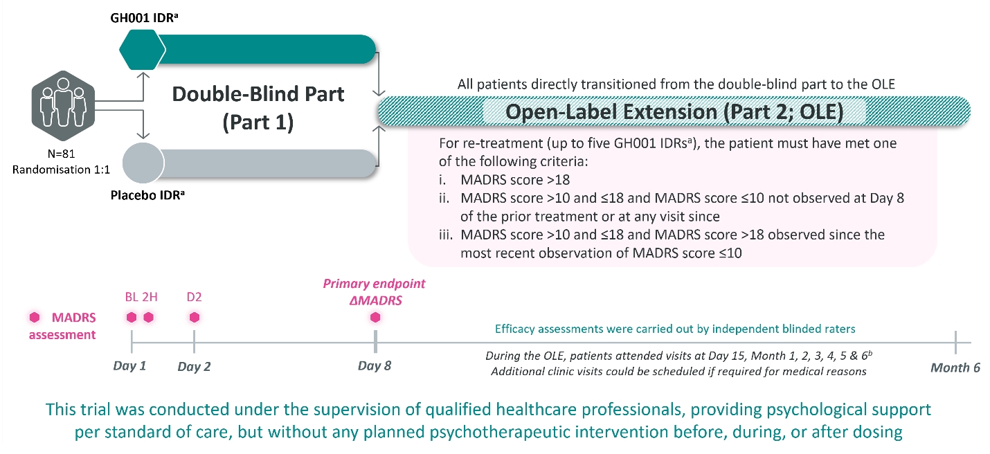 The trial included a 7-day, double-blind, placebo-controlled part and a 6-month OLE part (Figure 1). In the double-blind part, 81 patients were randomized 1:1 to receive either GH001 IDR or placebo on a single day (Day 1). Following completion of the double-blind part, all patients from the GH001 and placebo groups were automatically enrolled in the 6-month OLE, during which they were eligible for up to 5 GH001 IDR treatments, administered based on MADRS score criteria (Figure 1), with the goals of achieving and maintaining remission.