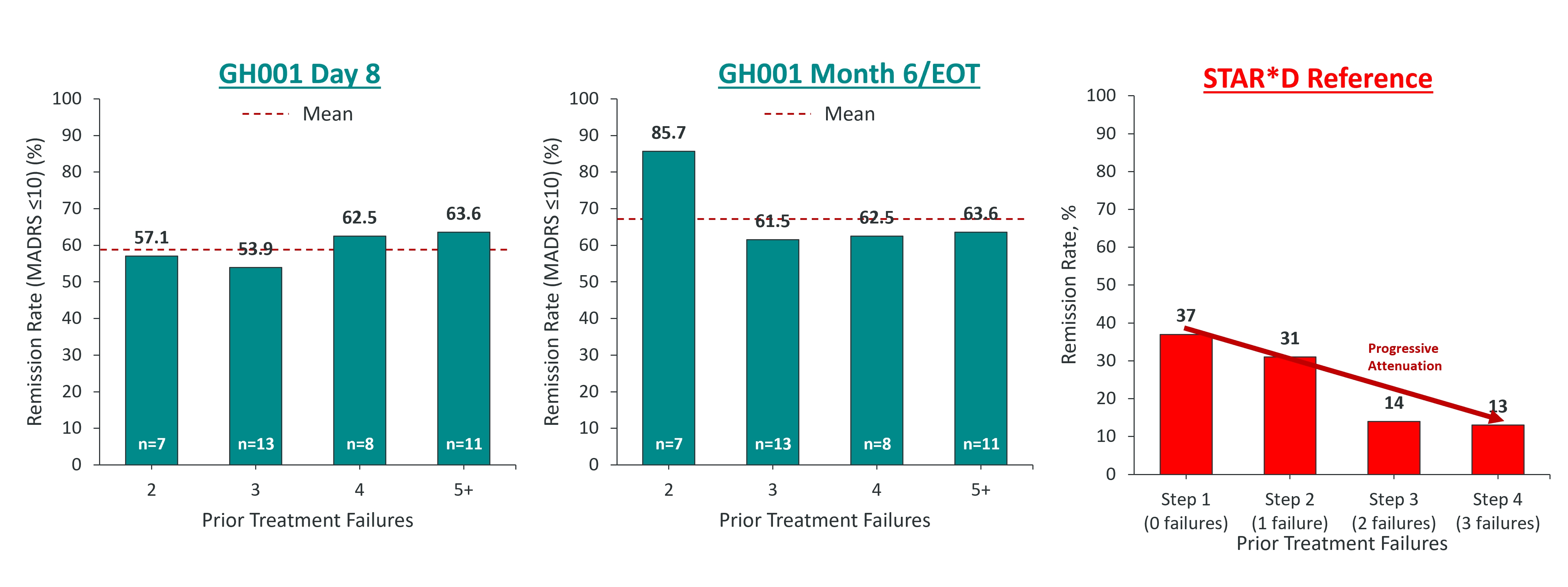 This post hoc analysis of the GH001-TRD-201 trial demonstrates that GH001 efficacy is independent of the number of prior lifetime treatment failures, a finding that contrasts the progressive attenuation of remission rates observed with conventional antidepressant therapies. Patients with 5 or more prior lifetime treatment failures achieved comparable remission rates to those with only 2 prior failures, both acutely (Day 8) and at end of treatment visit/Month 6. This treatment-history independence was consistent across primary and secondary efficacy endpoints. These findings support the potential of GH001 as a novel treatment for TRD, suggesting a therapeutic effect that is not attenuated by increasing prior treatment exposure.