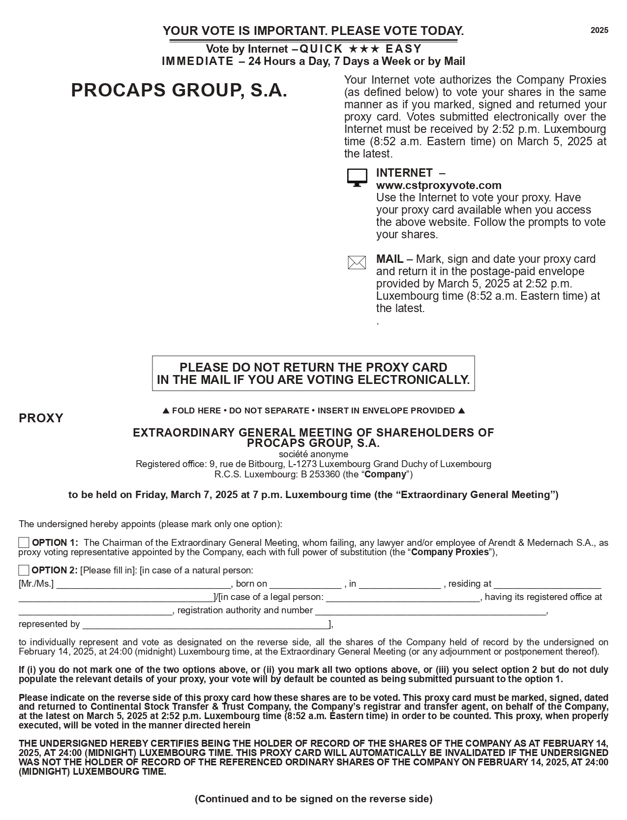 PROCAPS GROUP, S.A.  FOLD HERE • DO NOT SEPARATE • INSERT IN ENVELOPE PROVIDED  PROXY EXTRAORDINARY GENERAL MEETING OF SHAREHOLDERS OF PROCAPS GROUP, S.A. société anonyme Registered office: 9, rue de Bitbourg, L - 1273 Luxembourg Grand Duchy of Luxembourg R.C.S. Luxembourg: B 253360 (the “ Company ”) to be held on Friday, March 7, 2025 at 7 p.m. Luxembourg time (the “Extraordinary General Meeting”) The undersigned hereby appoints (please mark only one option): OPTION 1: The Chairman of the Extraordinary General Meeting, whom failing, any lawyer and/or employee of Arendt & Medernach S.A., as proxy voting representative appointed by the Company, each with full power of substitution (the “ Company Proxies ”), OPTION 2: [Please fill in]: [in case of a natural person: [Mr./Ms.] , born on , in , residing at ]/[in case of a legal person: , having its registered office at , registration authority and number , represented by ], to individually represent and vote as designated on the reverse side, all the shares of the Company held of record by the undersigned on February 14, 2025, at 24:00 (midnight) Luxembourg time, at the Extraordinary General Meeting (or any adjournment or postponement thereof). If (i) you do not mark one of the two options above, or (ii) you mark all two options above, or (iii) you select option 2 but do not duly populate the relevant details of your proxy, your vote will by default be counted as being submitted pursuant to the option 1 . Please indicate on the reverse side of this proxy card how these shares are to be voted . This proxy card must be marked, signed, dated and returned to Continental Stock Transfer & Trust Company, the Company’s registrar and transfer agent, on behalf of the Company, at the latest on March 5 , 2025 at 2 : 52 p . m . Luxembourg time ( 8 : 52 a . m . Eastern time) in order to be counted . This proxy, when properly executed, will be voted in the manner directed herein THE UNDERSIGNED HEREBY CERTIFIES BEING THE HOLDER OF RECORD OF THE SHARES OF THE COMPANY AS AT FEBRUARY 14 , 2025 , AT 24 : 00 (MIDNIGHT) LUXEMBOURG TIME . THIS PROXY CARD WILL AUTOMATICALLY BE INVALIDATED IF THE UNDERSIGNED WAS NOT THE HOLDER OF RECORD OF THE REFERENCED ORDINARY SHARES OF THE COMPANY ON FEBRUARY 14 , 2025 , AT 24 : 00 (MIDNIGHT) LUXEMBOURG TIME . (Continued and to be signed on the reverse side) PLEASE DO NOT RETURN THE PROXY CARD IN THE MAIL IF YOU ARE VOTING ELECTRONICALLY. Your Internet vote authorizes the Company Proxies (as defined below) to vote your shares in the same manner as if you marked, signed and returned your proxy card . Votes submitted electronically over the Internet must be received by 2 : 52 p . m . Luxembourg time ( 8 : 52 a . m . Eastern time) on March 5 , 2025 at the latest . INTERNET – www.cstproxyvote.com Use the Internet to vote your proxy. Have your proxy card available when you access the above website. Follow the prompts to vote your shares. MAIL – Mark, sign and date your proxy card and return it in the postage - paid envelope provided by March 5, 2025 at 2:52 p.m. Luxembourg time (8:52 a.m. Eastern time) at the latest. . YOUR VOTE IS IMPORTANT. PLEASE VOTE TODAY. Vote by Internet - QUICK YYY EASY IMMEDIATE - 24 Hours a Day, 7 Days a Week or by Mail 2025
