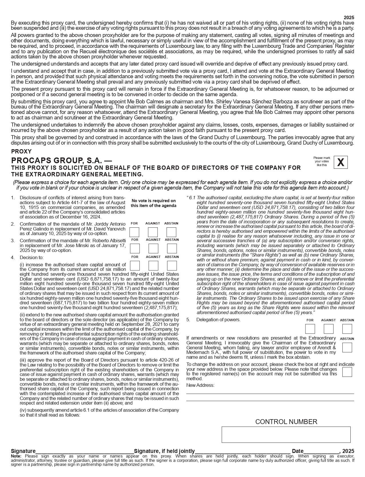 1. Disclosure of conflicts of interest arising from trans - actions subject to Article 441 - 7 of the law of August 10 , 1915 on commercial companies, as amended and article 22 of the Company’s consolidated articles of association as of December 16 , 2024 . 2. Confirmation of the mandate of Mr . Jorddy Antonio Perez Galindo in replacement of Mr . David Yanovich as of January 10 , 2025 by way of co - option . 3. Confirmation of the mandate of Mr . Roberto Albisetti in replacement of Mr . Jose Minski as of January 17 , 2025 by way of co - option . 4. Decision to : (i) increase the authorised share capital amount of the Company from its current amount of six million eight hundred seventy - one thousand seven hundred fifty - eight United States Dollar and seventeen cent (USD 6 , 871 , 758 . 17 ) to an amount of twenty - four million eight hundred seventy - one thousand seven hundred fifty - eight United States Dollar and seventeen cent (USD 24 , 871 , 758 . 17 ) and the related number of ordinary shares that may be issued in such respect from its current amount of six hundred eighty - seven million one hundred seventy - five thousand eight hun - dred seventeen ( 687 , 175 , 817 ) to two billion four hundred eighty - seven million one hundred seventy - five thousand eight hundred seventeen ( 2 , 487 , 175 , 817 ) ; (ii) extend to the new authorised share capital amount the authorisation granted to the board of directors or the sole director (as applicable) of the Company by virtue of an extraordinary general meeting held on September 28 , 2021 to carry out capital increases within the limit of the authorised capital of the Company, by removing or limiting the preferential subscription rights of the existing sharehold - ers of the Company in case of issue against payment in cash of ordinary shares, warrants (which may be separate or attached to ordinary shares, bonds, notes or similar instruments), convertible bonds, notes or similar instruments, within the framework of the authorised share capital of the Company ; (iii) approve the report of the Board of Directors pursuant to article 420 - 26 of the Law relating to the possibility of the Board of Directors to remove or limit the preferential subscription right of the existing shareholders of the Company in case of issue against payment in cash of ordinary shares, warrants (which may be separate or attached to ordinary shares, bonds, notes or similar instruments), convertible bonds, notes or similar instruments, within the framework of the au - thorised share capital of the Company, such report being issued in connection with the contemplated increase of the authorised share capital amount of the Company and the related number of ordinary shares that may be issued in such respect and related extension under item (ii) above ; and (iv) subsequently amend article 6 . 1 of the articles of association of the Company so that it shall read as follows : “ 6 . 1 The authorised capital, excluding the share capital, is set at twenty - four million eight hundred seventy - one thousand seven hundred fifty - eight United States Dollar and seventeen cent (USD 24 , 871 , 758 . 17 ), consisting of two billion four hundred eighty - seven million one hundred seventy - five thousand eight hun - dred seventeen ( 2 , 487 , 175 , 817 ) Ordinary Shares . During a period of five ( 5 ) years from the date of incorporation or any subsequent resolutions to create, renew or increase the authorised capital pursuant to this article, the board of di - rectors is hereby authorised and empowered within the limits of the authorised capital to (i) realise for any reason whatsoever including, any issue in one or several successive tranches of (a) any subscription and/or conversion rights, including warrants (which may be issued separately or attached to Ordinary Shares, bonds, options, notes or similar instruments), convertible bonds, notes or similar instruments (the “Share Rights”) as well as (b) new Ordinary Shares, with or without share premium, against payment in cash or in kind, by conver - sion of claims on the Company, by way of conversion of available reserves or in any other manner ; (ii) determine the place and date of the issue or the succes - sive issues, the issue price, the terms and conditions of the subscription of and paying up on the new Ordinary Shares ; and (iii) remove or limit the preferential subscription right of the shareholders in case of issue against payment in cash of Ordinary Shares, warrants (which may be separate or attached to Ordinary Shares, bonds, notes or similar instruments), convertible bonds, notes or simi - lar instruments . The Ordinary Shares to be issued upon exercise of any Share Rights may be issued beyond the aforementioned authorised capital period of five ( 5 ) years as long as the Share Rights were issued within the relevant aforementioned authorised capital period of five ( 5 ) years . ” 5. Delegation of powers. Signature Signature, if held jointly Date , 2025 Note : Please sign exactly as your name or names appear on this proxy . When shares are held jointly, each holder should sign . When signing as executor, administrator, attorney, trustee or guardian, please give full title as such . If the signer is a corporation, please sign full corporate name by duly authorized officer, giving full title as such . If signer is a partnership, please sign in partnership name by authorized person . CONTROL NUMBER Please mark your votes like this X PROCAPS GROUP, S.A. — THIS PROXY IS SOLICITED ON BEHALF OF THE BOARD OF DIRECTORS OF THE COMPANY FOR THE EXTRAORDINARY GENERAL MEETING. If amendments or new resolutions are presented at the Extraordinary ABSTAIN General Meeting, I irrevocably give the Chairman of the Extraordinary General Meeting, whom failing, any lawyer and/or employee of Arendt & Medernach S . A . , with full power of substitution, the power to vote in my name and as he/she deems fit, unless I mark the box abstain 