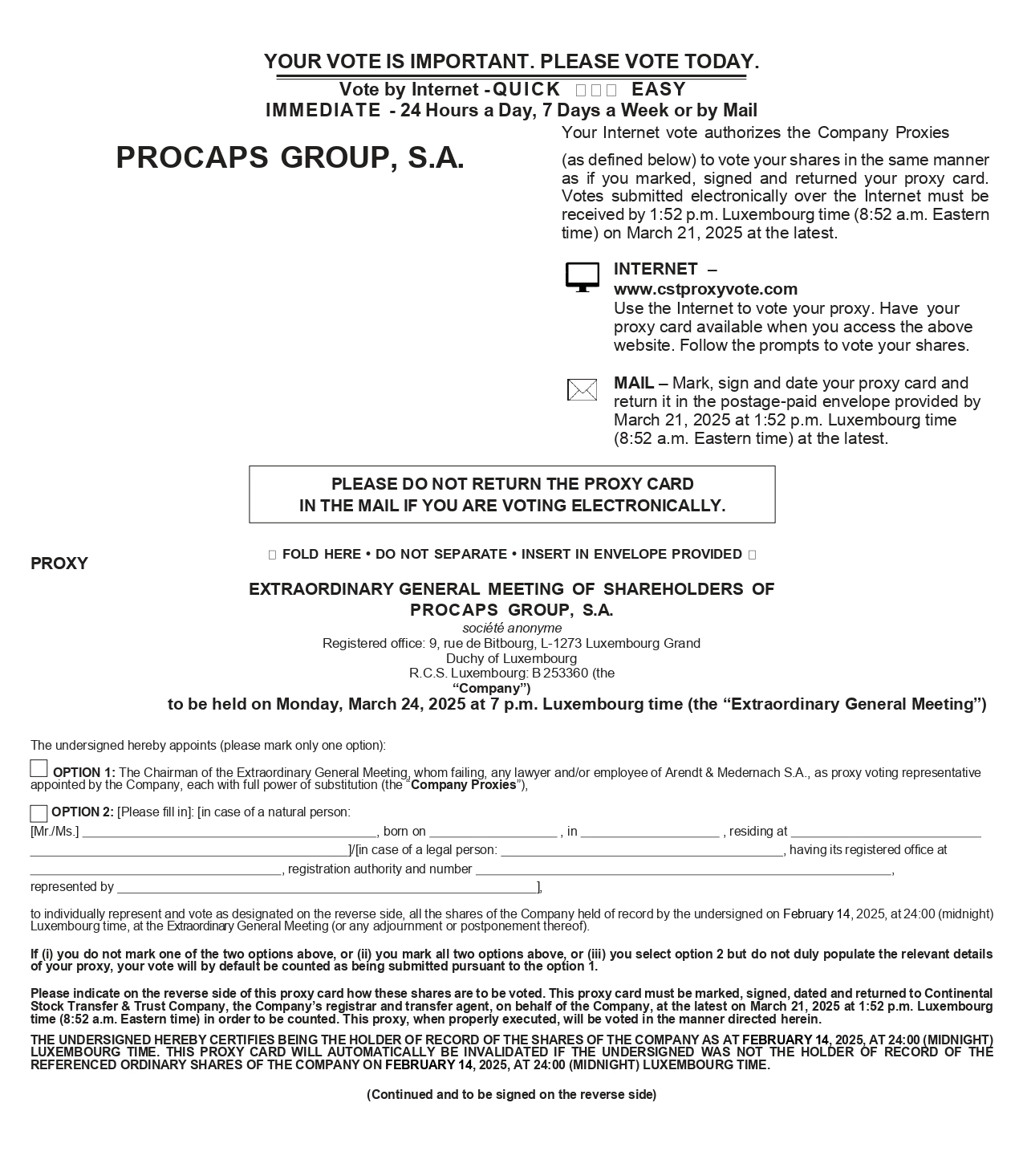 YOUR VOTE IS IMPORTANT. PLEASE VOTE TODAY. Vote by Internet - QUICK EASY IMMEDIATE - 24 Hours a Day, 7 Days a Week or by Mail Your Internet vote authorizes the Company Proxies PROCAPS GROUP, S.A. (as defined below) to vote your shares in the same manner as if you marked, signed and returned your proxy card . Votes submitted electronically over the Internet must be received by 1 : 52 p . m . Luxembourg time ( 8 : 52 a . m . Eastern time) on March 21 , 2025 at the latest . INTERNET – www.cstproxyvote.com Use the Internet to vote your proxy. Have your proxy card available when you access the above website. Follow the prompts to vote your shares. MAIL – Mark, sign and date your proxy card and return it in the postage - paid envelope provided by March 21, 2025 at 1:52 p.m. Luxembourg time (8:52 a.m. Eastern time) at the latest. PROXY FOLD HERE • DO NOT SEPARATE • INSERT IN ENVELOPE PROVIDED EXTRAORDINARY GENERAL MEETING OF SHAREHOLDERS OF PROCAPS GROUP, S.A. société anonyme Registered office: 9, rue de Bitbourg, L - 1273 Luxembourg Grand Duchy of Luxembourg R.C.S. Luxembourg: B 253360 (the “Company”) to be held on Monday, March 24, 2025 at 7 p.m. Luxembourg time (the “Extraordinary General Meeting”) The undersigned hereby appoints (please mark only one option): OPTION 1: The Chairman of the Extraordinary General Meeting, whom failing, any lawyer and/or employee of Arendt & Medernach S.A., as proxy voting representative appointed by the Company, each with full power of substitution (the “ Company Proxies ”), OPTION 2: [Please fill in]: [in case of a natural person: [Mr./Ms.] , born on , in , residing at ]/[in case of a legal person: , having its registered office at , registration authority and number , represented by ], to individually represent and vote as designated on the reverse side, all the shares of the Company held of record by the undersigned on February 14 , 2025, at 24:00 (midnight) Luxembourg time, at the Extraordinary General Meeting (or any adjournment or postponement thereof). If (i) you do not mark one of the two options above, or (ii) you mark all two options above, or (iii) you select option 2 but do not duly populate the relevant details of your proxy, your vote will by default be counted as being submitted pursuant to the option 1. Please indicate on the reverse side of this proxy card how these shares are to be voted . This proxy card must be marked, signed, dated and returned to Continental Stock Transfer & Trust Company, the Company’s registrar and transfer agent, on behalf of the Company, at the latest on March 21 , 2025 at 1 : 52 p . m . Luxembourg time ( 8 : 52 a . m . Eastern time) in order to be counted . This proxy, when properly executed, will be voted in the manner directed herein . THE UNDERSIGNED HEREBY CERTIFIES BEING THE HOLDER OF RECORD OF THE SHARES OF THE COMPANY AS AT FEBRUARY 14 , 2025 , AT 24 : 00 (MIDNIGHT) LUXEMBOURG TIME . THIS PROXY CARD WILL AUTOMATICALLY BE INVALIDATED IF THE UNDERSIGNED WAS NOT THE HOLDER OF RECORD OF THE REFERENCED ORDINARY SHARES OF THE COMPANY ON FEBRUARY 14 , 2025 , AT 24 : 00 (MIDNIGHT) LUXEMBOURG TIME . (Continued and to be signed on the reverse side) PLEASE DO NOT RETURN THE PROXY CARD IN THE MAIL IF YOU ARE VOTING ELECTRONICALLY.