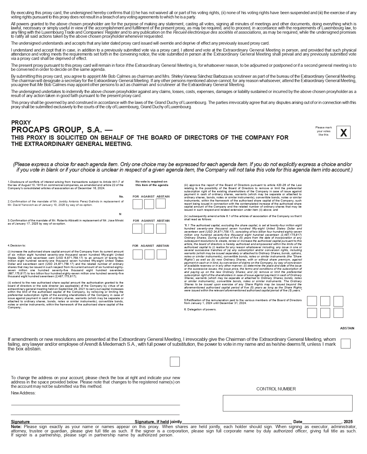 By executing this proxy card, the undersigned hereby confirms that (i) he has not waived all or part of his voting rights, (ii) none of his voting rights have been suspended and (iii) the exercise of any voting rights pursuant to this proxy does not result in a breach of any voting agreements to which he is a party. All powers granted to the above chosen proxyholder are for the purpose of making any statement, casting all votes, signing all minutes of meetings and other documents, doing everything which is lawful, necessary or simply useful in view of the accomplishment and fulfillment of the present proxy, as may be required, and to proceed, in accordance with the requirements of Luxembourg law, to any filing with the Luxembourg Trade and Companies’ Register and to any publication on the Recueil électronique des sociétés et associations , as may be required, while the undersigned promises to ratify all said actions taken by the above chosen proxyholder whenever requested . The undersigned understands and accepts that any later dated proxy card issued will override and deprive of effect any previously issued proxy card . I understand and accept that in case, in addition to a previously submitted vote via a proxy card, I attend and vote at the Extraordinary General Meeting in person, and provided that such physical attendance and voting meets the requirements set forth in the convening notice, the vote submitted in person at the Extraordinary General Meeting shall prevail and any previously submitted vote via a proxy card shall be deprived of effect . The present proxy pursuant to this proxy card will remain in force if the Extraordinary General Meeting is, for whatsoever reason, to be adjourned or postponed or if a second general meeting is to be convened in order to decide on the same agenda. B y submitting this proxy card, y o u agree to appoint Me Bob Calmes a s chairman a n d Mrs . Shirley Vanesa Sánchez Barboza a s scrutineer a s part of the bureau of the Extraordinary General Meeting . Th e chairman will designate a secretary for the Extraordinary General Meeting . If an y other persons mentioned a bo v e cannot, for an y reason whatsoever, attend the Extraordinary General Meeting, y o u agree that Me Bob Calmes may appoint other persons to act a s chairman an d scrutineer at the Extraordinary General Meeting . The undersigned undertakes to indemnify the above chosen proxyholder against any claims, losses, costs, expenses, damages or liability sustained or incurred by the above chosen proxyholder as a result of any action taken in good faith pursuant to the present proxy card. This proxy shall be governed by and construed in accordance with the laws of the Grand Duchy of Luxembourg. The parties irrevocably agree that any disputes arising out of or in connection with this proxy shall be submitted exclusively to the courts of the city of Luxembourg, Grand Duchy of Luxembourg. PROXY PROCAPS GROUP, S.A. — THIS PROXY IS SOLICITED ON BEHALF OF THE BOARD OF DIRECTORS OF THE COMPANY FOR THE EXTRAORDINARY GENERAL MEETING. Please mark your votes like this (Please express a choice for each agenda item. Only one choice may be expressed for each agenda item. If you do not explicitly express a choice and/or if you vote in blank or if your choice is unclear in respect of a given agenda item, the Company will not take this vote for this agenda item into account.) 1 . Disclosure of conflicts of interest arising from transactions subject to Article 441 - 7 of the law of August 10 , 1915 on commercial companies, as amended and article 22 of the Company's consolidated articles of association as of December 16 , 2024 . No. 2.Confirmation of the mandate of Mr. Jorddy Antonio Perez Galindo in replacement of Mr. David Yanovich as of January 10, 2025 by way of co - option. 3.Confirmation of the mandate of Mr. Roberto Albisetti in replacement of Mr. Jose Minski as of January 17, 2025 by way of co - option. 4. Decision to : (i) increase the authorised share capital amount of the Company from its current amount of six million eight hundred seventy - one thousand seven hundred fifty - eight United States Dollar and seventeen cent (USD 6 , 871 , 758 . 17 ) to an amount of twenty - four million eight hundred seventy - one thousand seven hundred fifty - eight United States Dollar and seventeen cent (USD 24 , 871 , 758 . 17 ) and the related number of ordinary shares that may be issued in such respect from its current amount of six hundred eighty - seven million one hundred seventy - five thousand eight hundred seventeen ( 687 , 175 , 817 ) to two billion four hundred eighty - seven million one hundred seventy - five thousand eight hundred seventeen ( 2 , 487 , 175 , 817 ) ; (ii) extend to the new authorised share capital amount the authorisation granted to the board of directors or the sole director (as applicable) of the Company by virtue of an extraordinary general meeting held on September 28 , 2021 to carry out capital increases within the limit of the authorised capital of the Company, by removing or limiting the preferential subscription rights of the existing shareholders of the Company in case of issue against payment in cash of ordinary shares, warrants (which may be separate or attached to ordinary shares, bonds, notes or similar instruments), convertible bonds, notes or similar instruments, within the framework of the authorised share capital of the Company ; FOR AGAINST ABSTAIN N FOR AGAINST ABSTAIN FOR AGAINST ABSTAIN (iii) approve the report of the Board of Directors pursuant to article 420 - 26 of the Law relating to the possibility of the Board of Directors to remove or limit the preferential subscription right of the existing shareholders of the Company in case of issue against payment in cash of ordinary shares, warrants (which may be separate or attached to ordinary shares, bonds, notes or similar instruments), convertible bonds, notes or similar instruments, within the framework of the