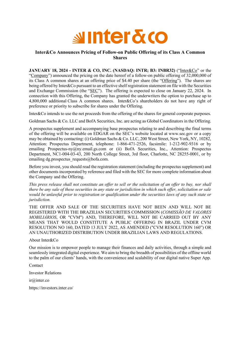 [AM_ACTIVE 405563246_4] Inter&Co Announces Pricing of Follow-on Public Offering of its Class A Common Shares JANUARY 18, 2024 - INTER & CO, INC. (NASDAQ: INTR; B3: INBR32) (“Inter&Co” or the “Company”) announced the pricing on the date hereof of a follow-on public offering of 32,000,000 of its Class A common shares at an offering price of $4.40 per share (the “Offering”). The shares are being offered by Inter&Co pursuant to an effective shelf registration statement on file with the Securities and Exchange Commission (the “SEC”). The offering is expected to close on January 22, 2024. In connection with this Offering, the Company has granted the underwriters the option to purchase up to 4,800,000 additional Class A common shares. Inter&Co’s shareholders do not have any right of preference or priority to subscribe for shares under the Offering. Inter&Co intends to use the net proceeds from the offering of the shares for general corporate purposes. Goldman Sachs & Co. LLC and BofA Securities, Inc. are acting as Global Coordinators in the Offering. A prospectus supplement and accompanying base prospectus relating to and describing the final terms of the offering will be available on EDGAR on the SEC’s website located at www.sec.gov or a copy may be obtained by contacting: (i) Goldman Sachs & Co. LLC, 200 West Street, New York, NY, 10282, Attention: Prospectus Department, telephone: 1-866-471-2526, facsimile: 1-212-902-9316 or by emailing Prospectus-ny@ny.email.gs.com or (ii) BofA Securities, Inc., Attention: Prospectus Department, NC1-004-03-43, 200 North College Street, 3rd floor, Charlotte, NC 28255-0001, or by emailing dg.prospectus_requests@bofa.com. Before you invest, you should read the registration statement (including the prospectus supplement) and other documents incorporated by reference and filed with the SEC for more complete information about the Company and the Offering. This press release shall not constitute an offer to sell or the solicitation of an offer to buy, nor shall there be any sale of these securities in any state or jurisdiction in which such offer, solicitation or sale would be unlawful prior to registration or qualification under the securities laws of any such state or jurisdiction. THE OFFER AND SALE OF THE SECURITIES HAVE NOT BEEN AND WILL NOT BE REGISTERED WITH THE BRAZILIAN SECURITIES COMMISSION (COMISSÃO DE VALORES MOBILIÁRIOS, OR "CVM") AND, THEREFORE, WILL NOT BE CARRIED OUT BY ANY MEANS THAT WOULD CONSTITUTE A PUBLIC OFFERING IN BRAZIL UNDER CVM RESOLUTION NO 160, DATED 13 JULY 2022, AS AMENDED ("CVM RESOLUTION 160”) OR AN UNAUTHORIZED DISTRIBUTION UNDER BRAZILIAN LAWS AND REGULATIONS. About Inter&Co Our mission is to empower people to manage their finances and daily activities, through a simple and seamlessly integrated digital experience. We aim to bring the breadth of possibilities of the offline world to the palm of our clients’ hands, with the convenience and scalability of our digital native Super App. Contact Investor Relations ir@inter.co https://investors.inter.co/