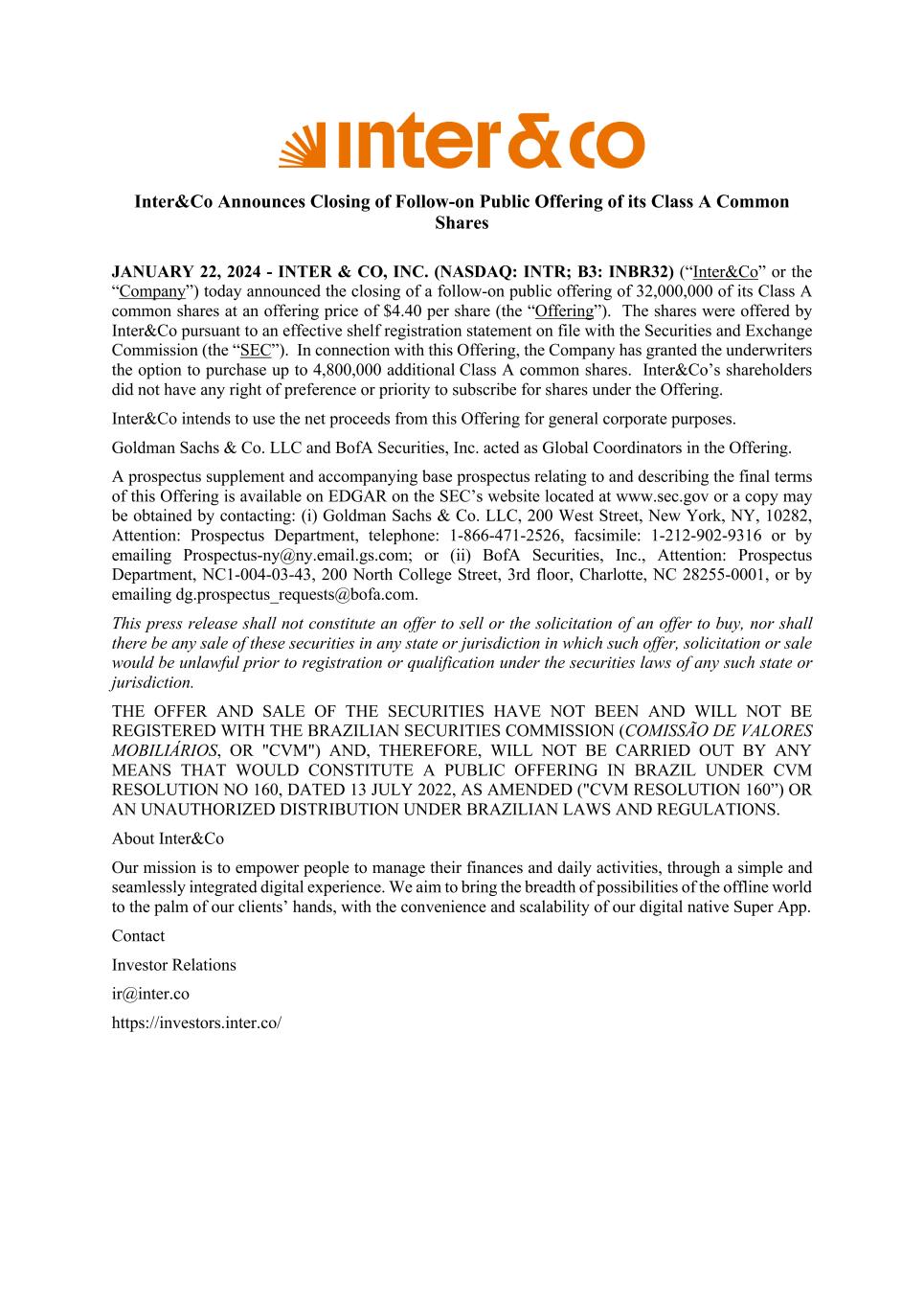 Inter&Co Announces Closing of Follow-on Public Offering of its Class A Common Shares JANUARY 22, 2024 - INTER & CO, INC. (NASDAQ: INTR; B3: INBR32) (“Inter&Co” or the “Company”) today announced the closing of a follow-on public offering of 32,000,000 of its Class A common shares at an offering price of $4.40 per share (the “Offering”). The shares were offered by Inter&Co pursuant to an effective shelf registration statement on file with the Securities and Exchange Commission (the “SEC”). In connection with this Offering, the Company has granted the underwriters the option to purchase up to 4,800,000 additional Class A common shares. Inter&Co’s shareholders did not have any right of preference or priority to subscribe for shares under the Offering. Inter&Co intends to use the net proceeds from this Offering for general corporate purposes. Goldman Sachs & Co. LLC and BofA Securities, Inc. acted as Global Coordinators in the Offering. A prospectus supplement and accompanying base prospectus relating to and describing the final terms of this Offering is available on EDGAR on the SEC’s website located at www.sec.gov or a copy may be obtained by contacting: (i) Goldman Sachs & Co. LLC, 200 West Street, New York, NY, 10282, Attention: Prospectus Department, telephone: 1-866-471-2526, facsimile: 1-212-902-9316 or by emailing Prospectus-ny@ny.email.gs.com; or (ii) BofA Securities, Inc., Attention: Prospectus Department, NC1-004-03-43, 200 North College Street, 3rd floor, Charlotte, NC 28255-0001, or by emailing dg.prospectus_requests@bofa.com. This press release shall not constitute an offer to sell or the solicitation of an offer to buy, nor shall there be any sale of these securities in any state or jurisdiction in which such offer, solicitation or sale would be unlawful prior to registration or qualification under the securities laws of any such state or jurisdiction. THE OFFER AND SALE OF THE SECURITIES HAVE NOT BEEN AND WILL NOT BE REGISTERED WITH THE BRAZILIAN SECURITIES COMMISSION (COMISSÃO DE VALORES MOBILIÁRIOS, OR "CVM") AND, THEREFORE, WILL NOT BE CARRIED OUT BY ANY MEANS THAT WOULD CONSTITUTE A PUBLIC OFFERING IN BRAZIL UNDER CVM RESOLUTION NO 160, DATED 13 JULY 2022, AS AMENDED ("CVM RESOLUTION 160”) OR AN UNAUTHORIZED DISTRIBUTION UNDER BRAZILIAN LAWS AND REGULATIONS. About Inter&Co Our mission is to empower people to manage their finances and daily activities, through a simple and seamlessly integrated digital experience. We aim to bring the breadth of possibilities of the offline world to the palm of our clients’ hands, with the convenience and scalability of our digital native Super App. Contact Investor Relations ir@inter.co https://investors.inter.co/