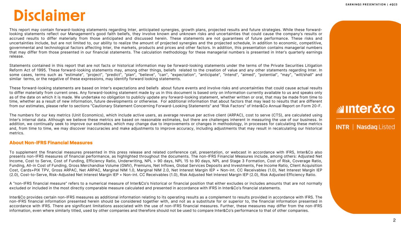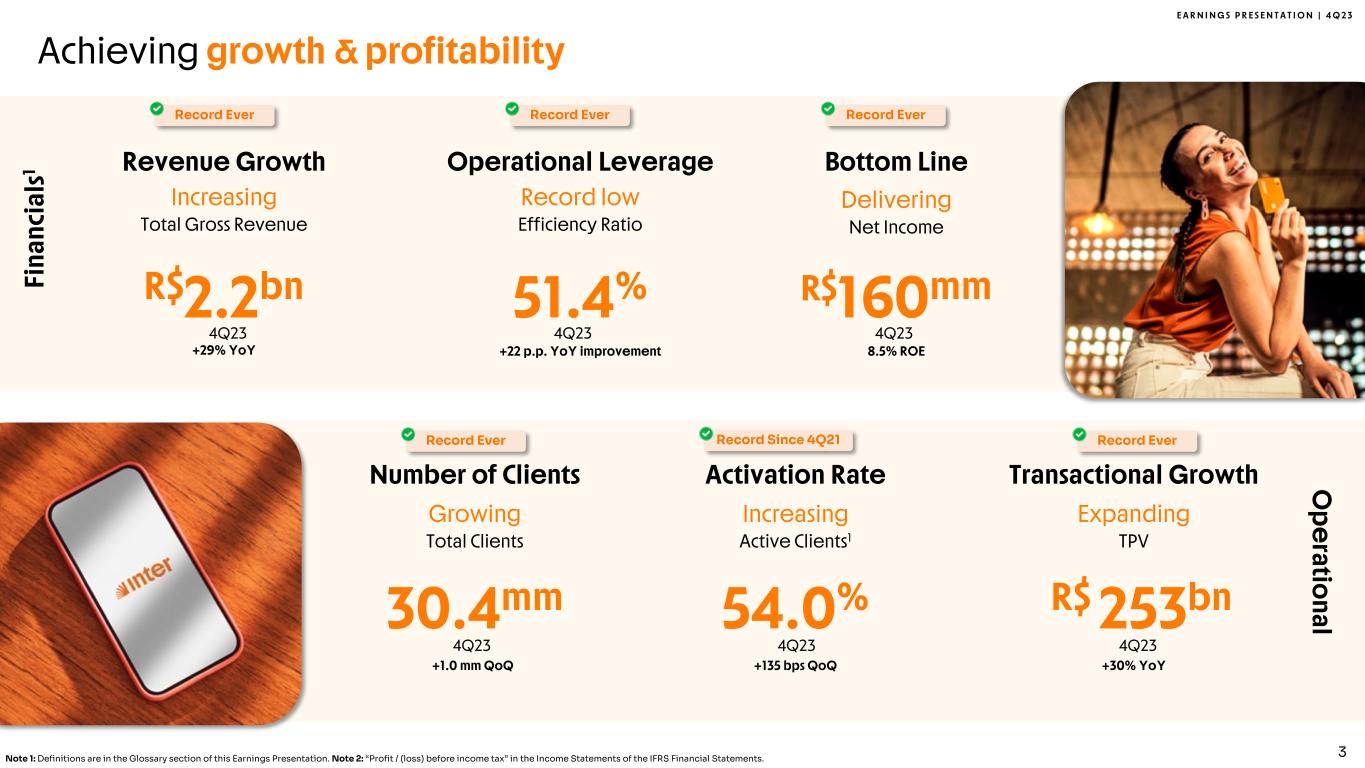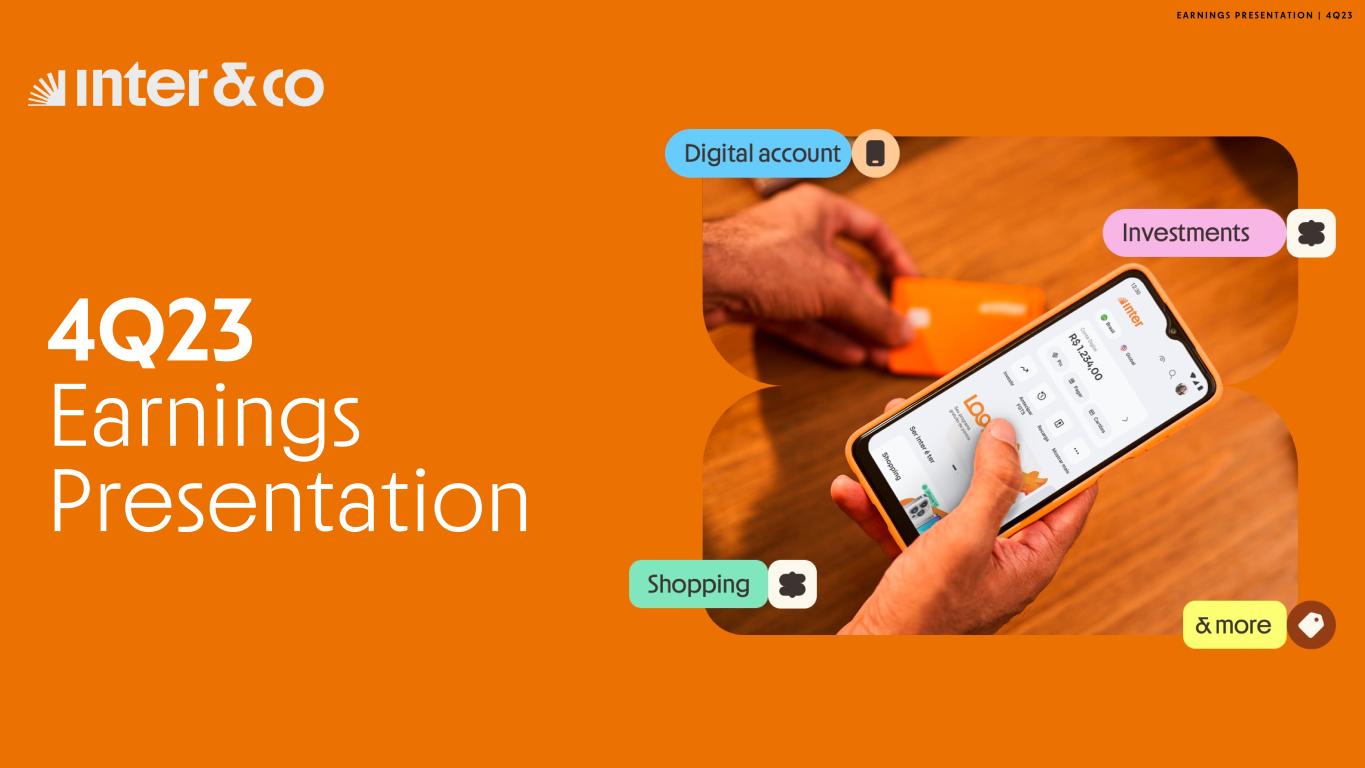 E A R N I N G S P R E S E N T A T I O N | 4 Q 2 3 This report may contain forward-looking statements regarding Inter, anticipated synergies, growth plans, projected results and future strategies. While these forward- looking statements reflect our Management’s good faith beliefs, they involve known and unknown risks and uncertainties that could cause the company’s results or accrued results to differ materially from those anticipated and discussed herein. These statements are not guarantees of future performance. These risks and uncertainties include, but are not limited to, our ability to realize the amount of projected synergies and the projected schedule, in addition to economic, competitive, governmental and technological factors affecting Inter, the markets, products and prices and other factors. In addition, this presentation contains managerial numbers that may differ from those presented in our financial statements. The calculation methodology for these managerial numbers is presented in Inter’s quarterly earnings release. Statements contained in this report that are not facts or historical information may be forward-looking statements under the terms of the Private Securities Litigation Reform Act of 1995. These forward-looking statements may, among other things, beliefs related to the creation of value and any other statements regarding Inter. In some cases, terms such as “estimate”, “project”, “predict”, “plan”, “believe”, “can”, “expectation”, “anticipate”, “intend”, “aimed”, “potential”, “may”, “will/shall” and similar terms, or the negative of these expressions, may identify forward looking statements. These forward-looking statements are based on Inter's expectations and beliefs about future events and involve risks and uncertainties that could cause actual results to differ materially from current ones. Any forward-looking statement made by us in this document is based only on information currently available to us and speaks only as of the date on which it is made. We undertake no obligation to publicly update any forward-looking statement, whether written or oral, that may be made from time to time, whether as a result of new information, future developments or otherwise. For additional information that about factors that may lead to results that are different from our estimates, please refer to sections “Cautionary Statement Concerning Forward-Looking Statements” and “Risk Factors” of Inter&Co Annual Report on Form 20-F. The numbers for our key metrics (Unit Economics), which include active users, as average revenue per active client (ARPAC), cost to serve (CTS), are calculated using Inter’s internal data. Although we believe these metrics are based on reasonable estimates, but there are challenges inherent in measuring the use of our business. In addition, we continually seek to improve our estimates, which may change due to improvements or changes in methodology, in processes for calculating these metrics and, from time to time, we may discover inaccuracies and make adjustments to improve accuracy, including adjustments that may result in recalculating our historical metrics. About Non-IFRS Financial Measures To supplement the financial measures presented in this press release and related conference call, presentation, or webcast in accordance with IFRS, Inter&Co also presents non-IFRS measures of financial performance, as highlighted throughout the documents. The non-IFRS Financial Measures include, among others: Adjusted Net Income, Cost to Serve, Cost of Funding, Efficiency Ratio, Underwriting, NPL > 90 days, NPL 15 to 90 days, NPL and Stage 3 Formation, Cost of Risk, Coverage Ratio, Funding, All-in Cost of Funding, Gross Merchandise Volume (GMV), Premiuns, Net Inflows, Global Services Deposits and Investments, Fee Income Ratio, Client Acquisition Cost, Cards+PIX TPV, Gross ARPAC, Net ARPAC, Marginal NIM 1.0, Marginal NIM 2.0, Net Interest Margin IEP + Non-int. CC Receivables (1.0), Net Interest Margin IEP (2.0), Cost-to-Serve, Risk-Adjusted Net Interest Margin IEP + Non-int. CC Receivables (1.0), Risk Adjusted Net Interest Margin IEP (2.0), Risk Adjusted Efficiency Ratio. A “non-IFRS financial measure” refers to a numerical measure of Inter&Co’s historical or financial position that either excludes or includes amounts that are not normally excluded or included in the most directly comparable measure calculated and presented in accordance with IFRS in Inter&Co’s financial statements. Inter&Co provides certain non-IFRS measures as additional information relating to its operating results as a complement to results provided in accordance with IFRS. The non-IFRS financial information presented herein should be considered together with, and not as a substitute for or superior to, the financial information presented in accordance with IFRS. There are significant limitations associated with the use of non-IFRS financial measures. Further, these measures may differ from the non-IFRS information, even where similarly titled, used by other companies and therefore should not be used to compare Inter&Co’s performance to that of other companies. Disclaimer 2
