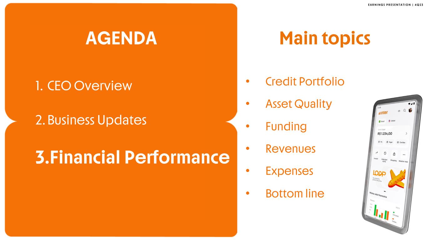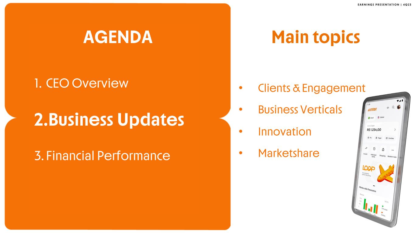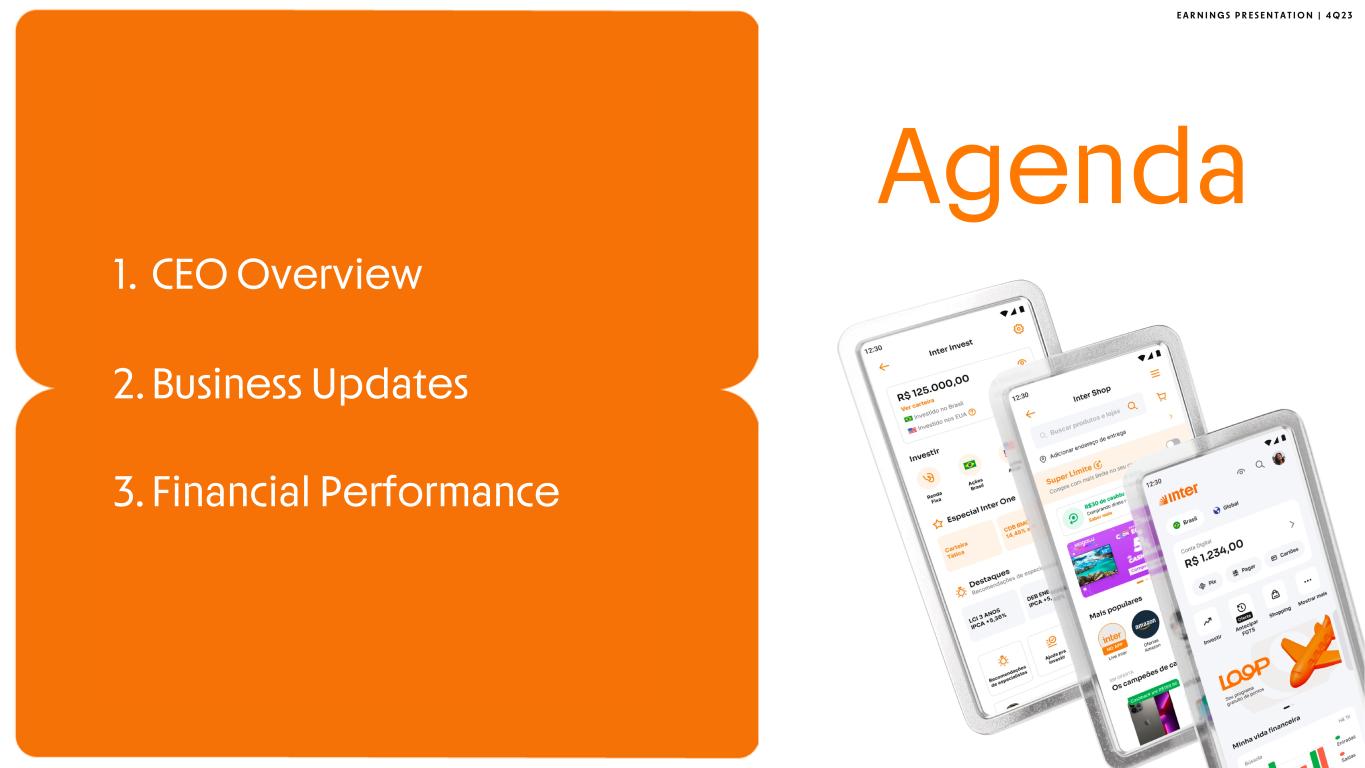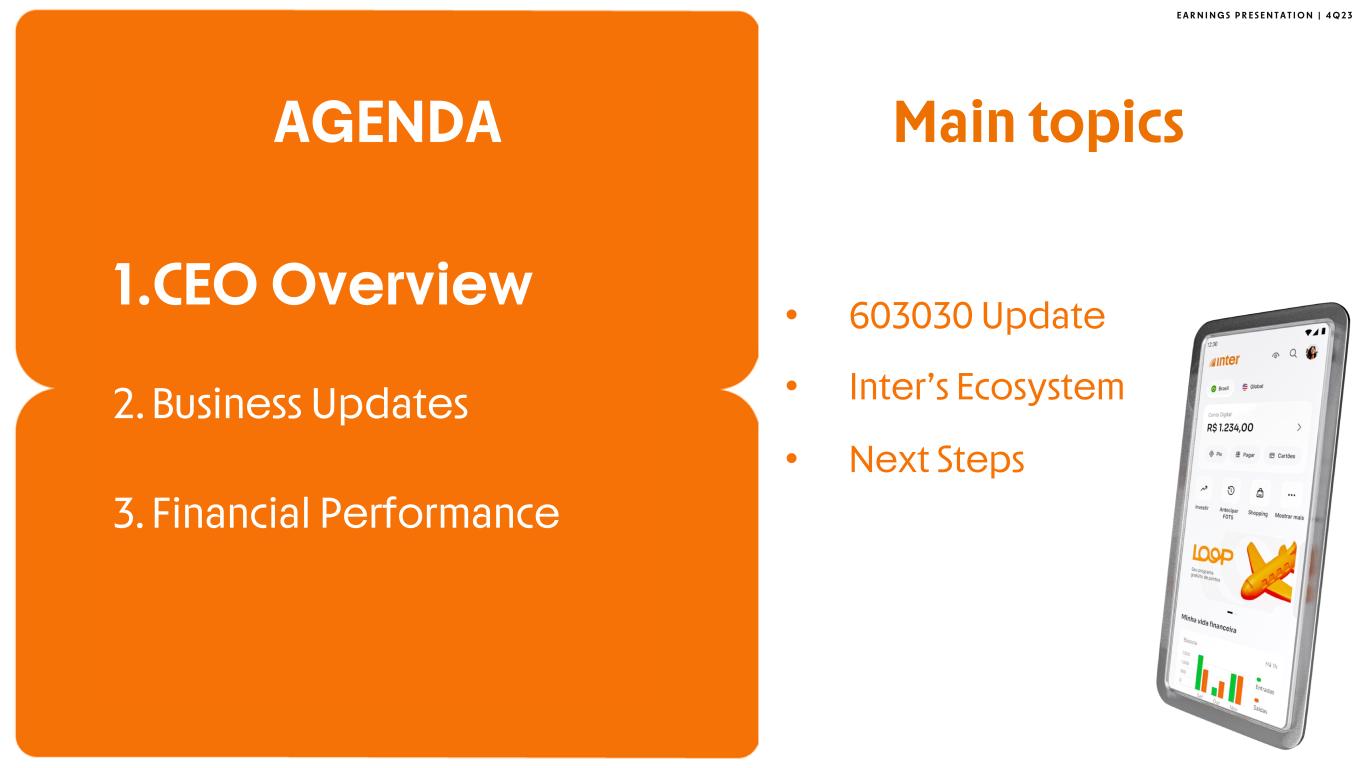 E A R N I N G S P R E S E N T A T I O N | 4 Q 2 3 • 603030 Update • Inter’s Ecosystem • Next Steps AGENDA 1.CEO Overview 2. Business Updates 3. Financial Performance Main topics