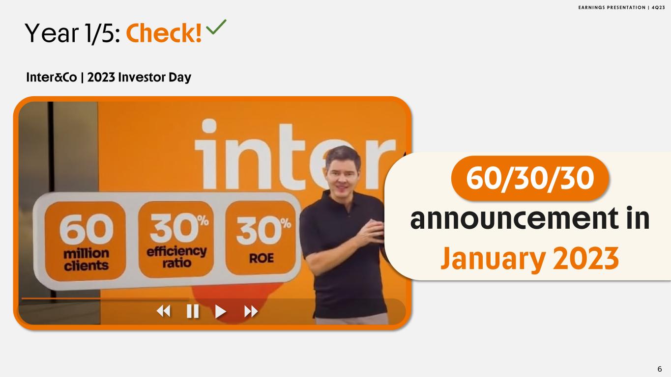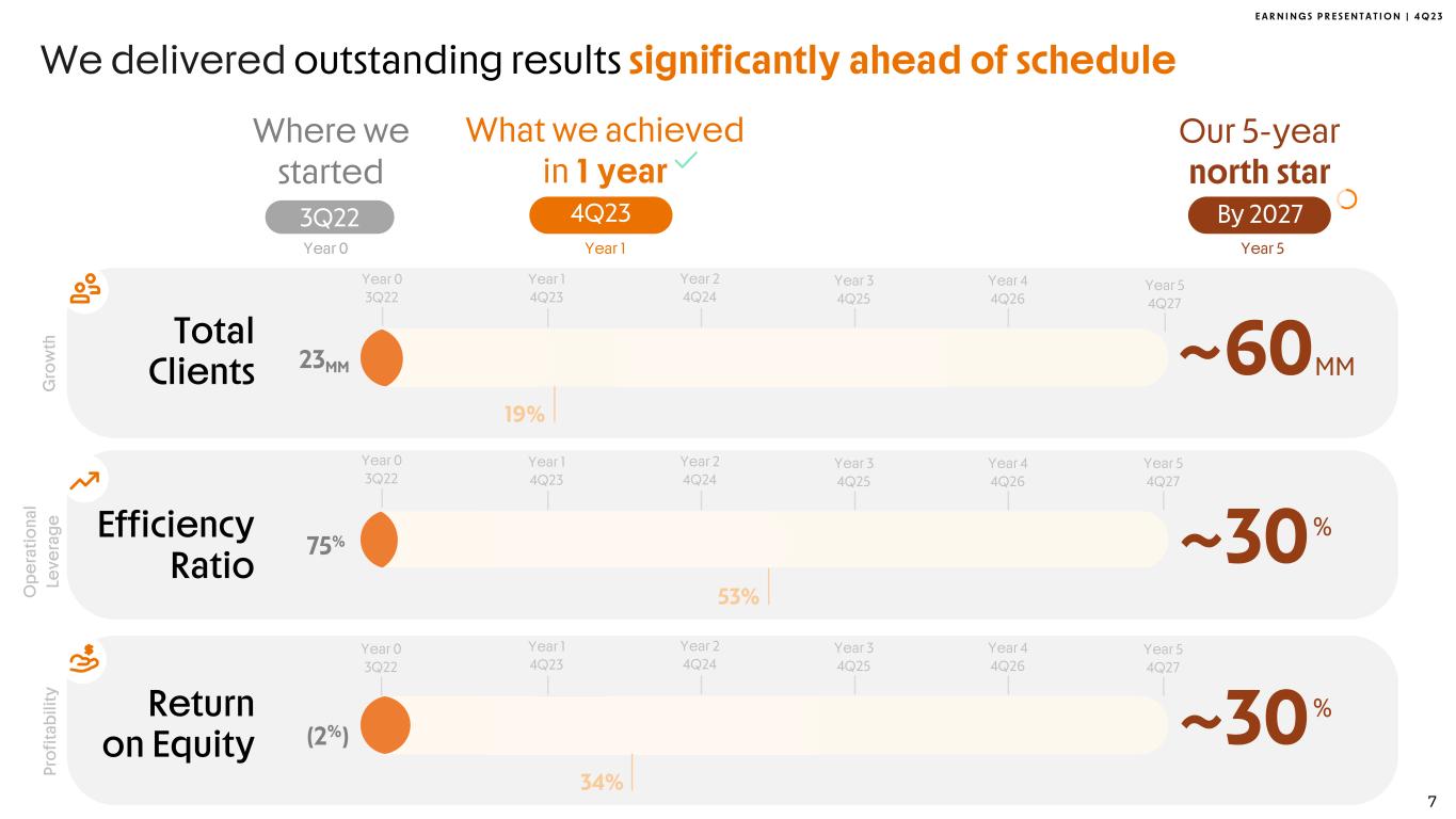 E A R N I N G S P R E S E N T A T I O N | 4 Q 2 3 Year 1/5: Check! Inter&Co | 2023 Investor Day 6 60/30/30 announcement in January 2023