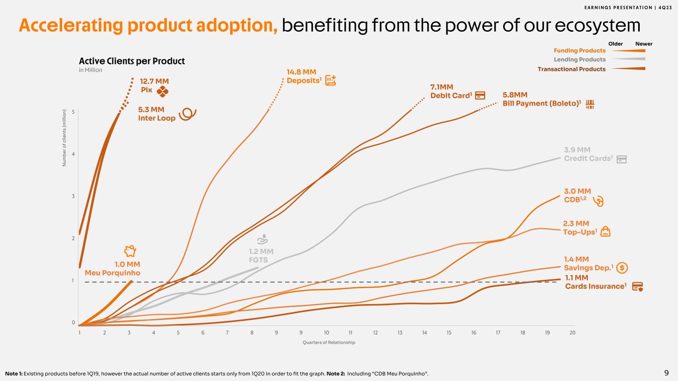 E A R N I N G S P R E S E N T A T I O N | 4 Q 2 3 12.7 MM Pix 5.3 MM Inter Loop 1.0 MM Meu Porquinho 1.2 MM FGTS 14.8 MM Deposits1 7.1MM Debit Card1 5.8MM Bill Payment (Boleto)1 3.9 MM Credit Cards1 3.0 MM CDB1,2 2.3 MM Top-Ups1 1.4 MM Savings Dep.1 1.1 MM Cards Insurance1 9 Active Clients per Product in Million Note 1: Existing products before 1Q19, however the actual number of active clients starts only from 1Q20 in order to fit the graph. Note 2: Including “CDB Meu Porquinho”. Accelerating product adoption, benefiting from the power of our ecosystem 1 202 3 4 5 6 7 8 9 9 10 11 12 13 14 15 16 17 18 19 5 4 3 2 1 0 N um be r o f c lie nt s (m ill io n) Quarters of Relationship Older Funding Products Lending Products Newer Transactional Products
