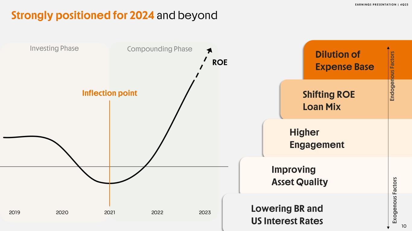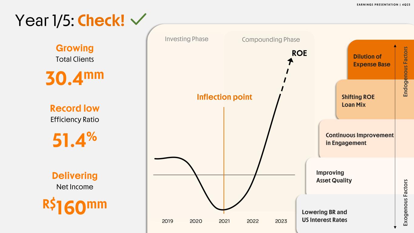 E A R N I N G S P R E S E N T A T I O N | 4 Q 2 3 Record low Efficiency Ratio 51.4% Delivering Net Income R$160mm 30.4mm Growing Total Clients Year 1/5: Check! 2019 2020 2021 2022 2023 Inflection point Dilution of Expense Base Shifting ROE Loan Mix Continuous Improvement in Engagement Improving Asset Quality Lowering BR and US Interest Rates En do ge no us F ac to rs Ex og en ou s F ac to rs ROE Investing Phase Compounding Phase