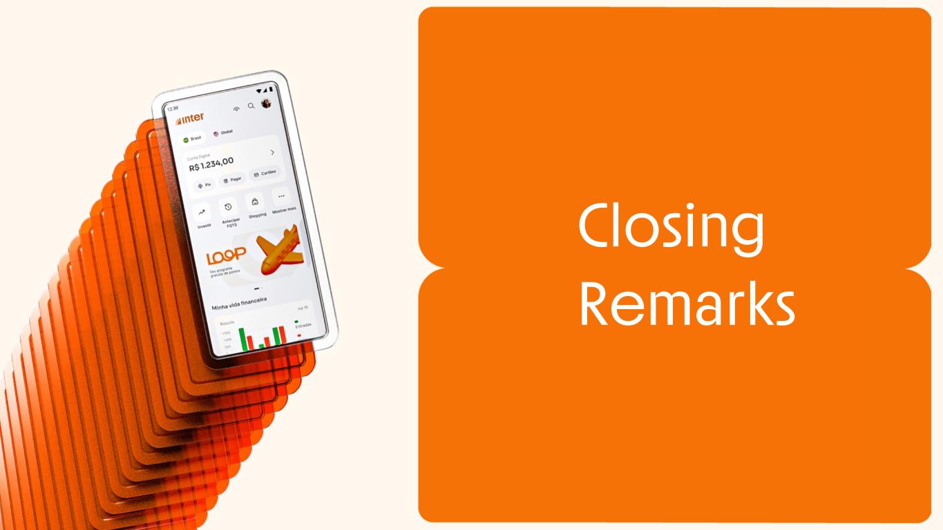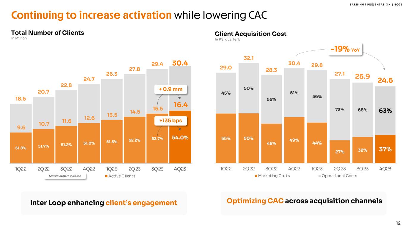 E A R N I N G S P R E S E N T A T I O N | 4 Q 2 3 Continuing to increase activation while lowering CAC Client Acquisition Cost In R$, quarterly 55% 50% 45% 49% 44% 27% 32% 37% 45% 50% 55% 51% 56% 73% 68% 63% 29.0 32.1 28.3 30.4 29.8 27.1 25.9 24.6 1Q22 2Q22 3Q22 4Q22 1Q23 2Q23 3Q23 4Q23 Marketing Costs Operational Costs -19% YoY 51.8% 51.7% 51.2% 51.0% 51.5% 52.2% 52.7% 54.0% 9.6 10.7 11.6 12.6 13.5 14.5 15.5 16.4 18.6 20.7 22.8 24.7 26.3 27.8 29.4 30.4 - 5 .0 1 0. 1 5.0 2 0. 2 5.0 3 0. 1Q22 2Q22 3Q22 4Q22 1Q23 2Q23 3Q23 4Q23 Active Clients Total Number of Clients In Million Activation Rate increase 12 + 0.9 mm +135 bps Optimizing CAC across acquisition channels Inter Loop enhancing client’s engagement