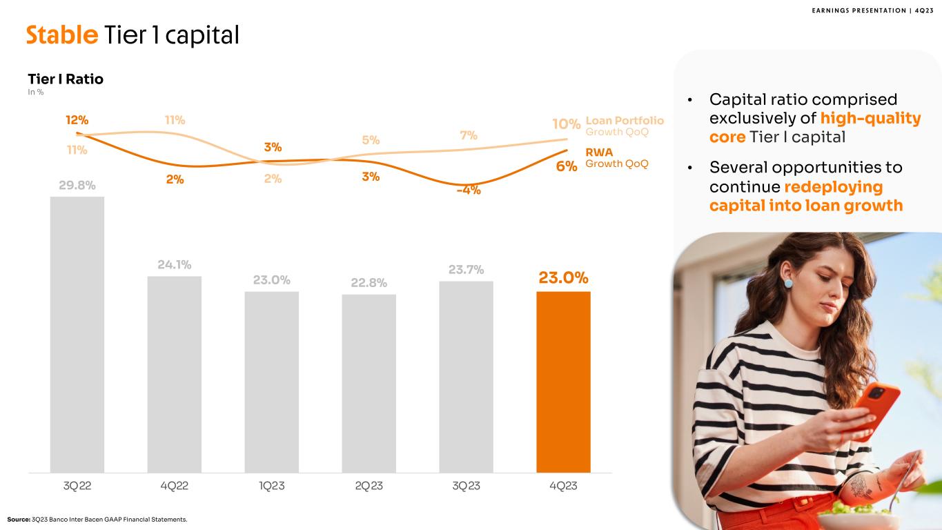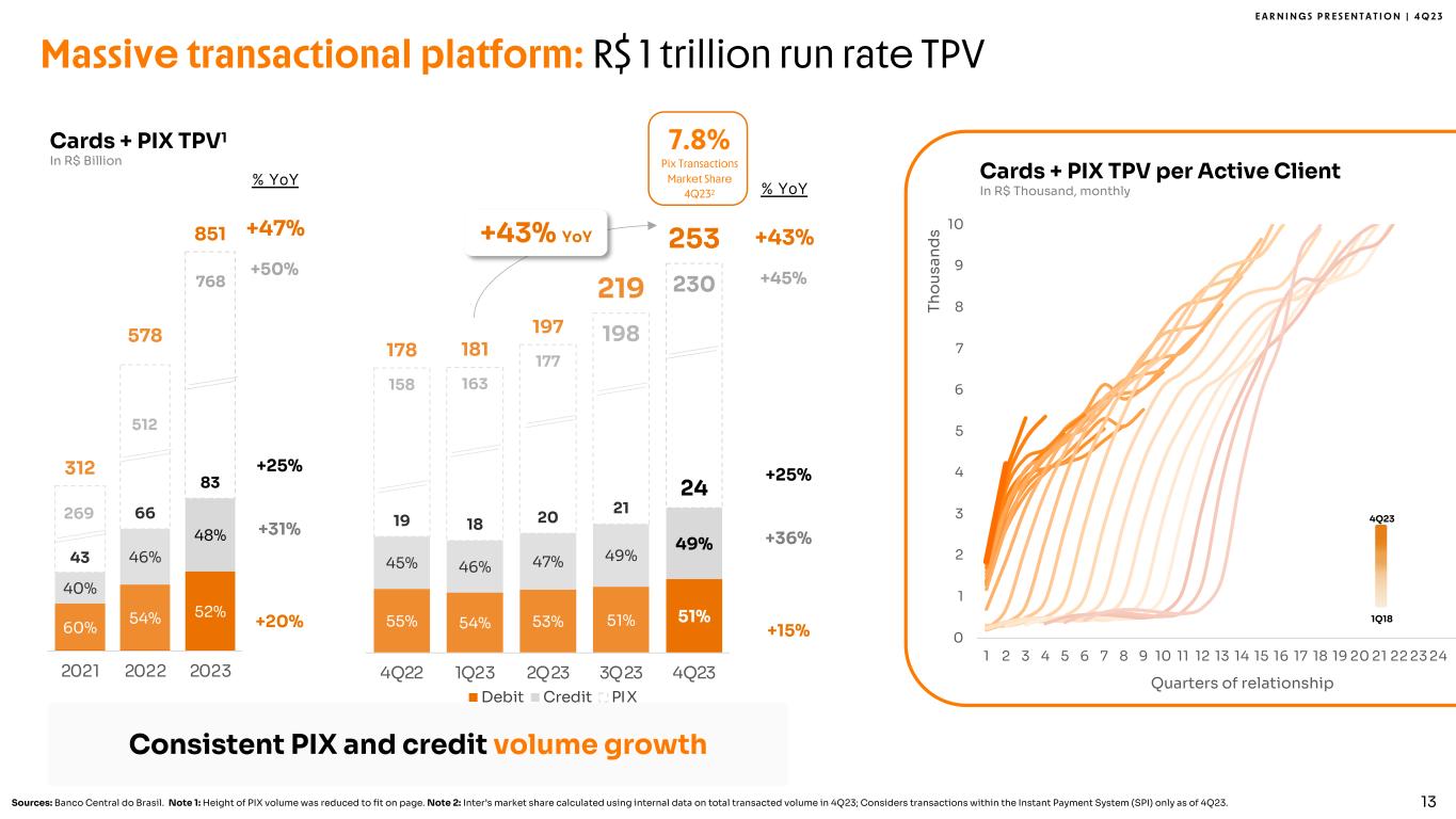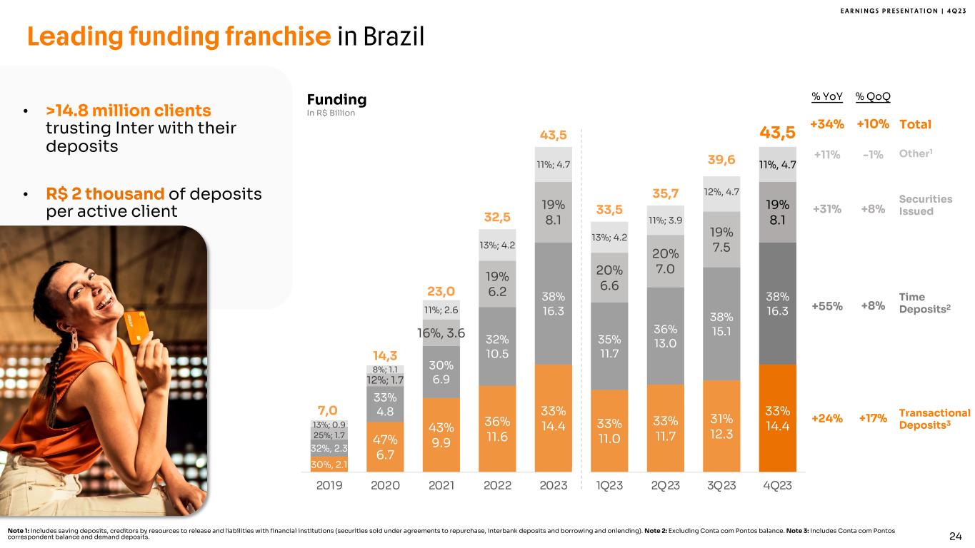 E A R N I N G S P R E S E N T A T I O N | 4 Q 2 3 30%, 2.1 47% 6.7 43% 9.9 36% 11.6 33% 14.4 33% 11.0 33% 11.7 31% 12.3 33% 14.4 32%, 2.3 33% 4.8 30% 6.9 32% 10.5 38% 16.3 35% 11.7 36% 13.0 38% 15.1 38% 16.3 25%; 1.7 12%; 1.7 16%, 3.6 19% 6.2 19% 8.1 20% 6.6 20% 7.0 19% 7.5 19% 8.1 13%; 0.9 8%; 1.1 11%; 2.6 13%; 4.2 11%; 4.7 13%; 4.2 11%; 3.9 12%, 4.7 11%, 4.7 7,0 14,3 23,0 32,5 43,5 33,5 35,7 39,6 43,5 2019 2020 2021 2022 2023 1Q23 2Q23 3Q23 4Q23 Leading funding franchise in Brazil Time Deposits2 Securities Issued Other1 Note 1: Includes saving deposits, creditors by resources to release and liabilities with financial institutions (securities sold under agreements to repurchase, interbank deposits and borrowing and onlending). Note 2: Excluding Conta com Pontos balance. Note 3: Includes Conta com Pontos correspondent balance and demand deposits. Transactional Deposits3 Total +11% % YoY % QoQ -1% +31% +8% +55% +8% +24% +17% +34% +10% Funding In R$ Billion• >14.8 million clients trusting Inter with their deposits • R$ 2 thousand of deposits per active client 24