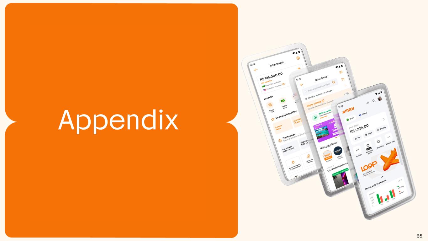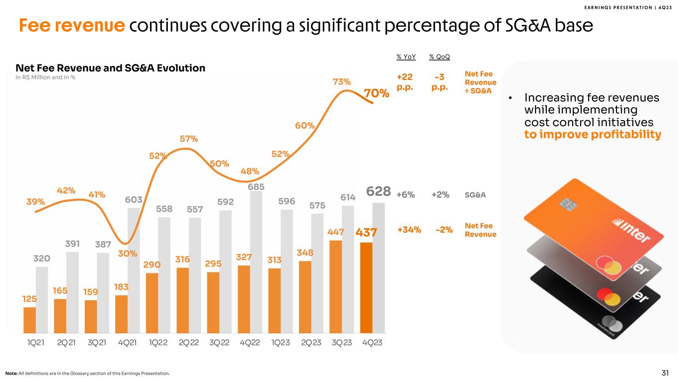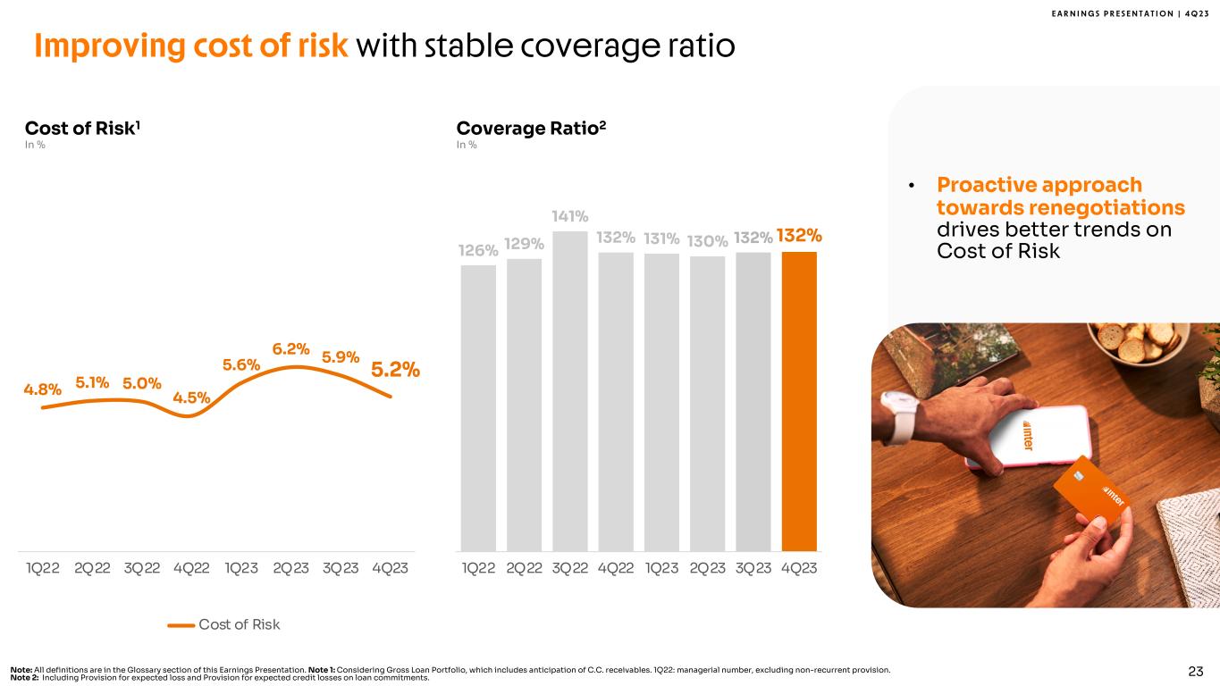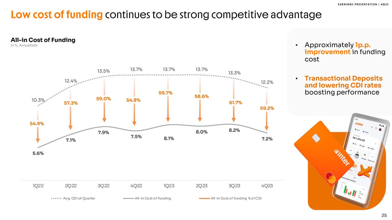 E A R N I N G S P R E S E N T A T I O N | 4 Q 2 3 30%, 2.1 47% 6.7 43% 9.9 36% 11.6 33% 14.4 33% 11.0 33% 11.7 31% 12.3 33% 14.4 32%, 2.3 33% 4.8 30% 6.9 32% 10.5 38% 16.3 35% 11.7 36% 13.0 38% 15.1 38% 16.3 25%; 1.7 12%; 1.7 16%, 3.6 19% 6.2 19% 8.1 20% 6.6 20% 7.0 19% 7.5 19% 8.1 13%; 0.9 8%; 1.1 11%; 2.6 13%; 4.2 11%; 4.7 13%; 4.2 11%; 3.9 12%, 4.7 11%, 4.7 7,0 14,3 23,0 32,5 43,5 33,5 35,7 39,6 43,5 2019 2020 2021 2022 2023 1Q23 2Q23 3Q23 4Q23 Leading funding franchise in Brazil Time Deposits2 Securities Issued Other1 Note 1: Includes saving deposits, creditors by resources to release and liabilities with financial institutions (securities sold under agreements to repurchase, interbank deposits and borrowing and onlending). Note 2: Excluding Conta com Pontos balance. Note 3: Includes Conta com Pontos correspondent balance and demand deposits. Transactional Deposits3 Total +11% % YoY % QoQ -1% +31% +8% +55% +8% +24% +17% +34% +10% Funding In R$ Billion• >14.8 million clients trusting Inter with their deposits • R$ 2 thousand of deposits per active client 24