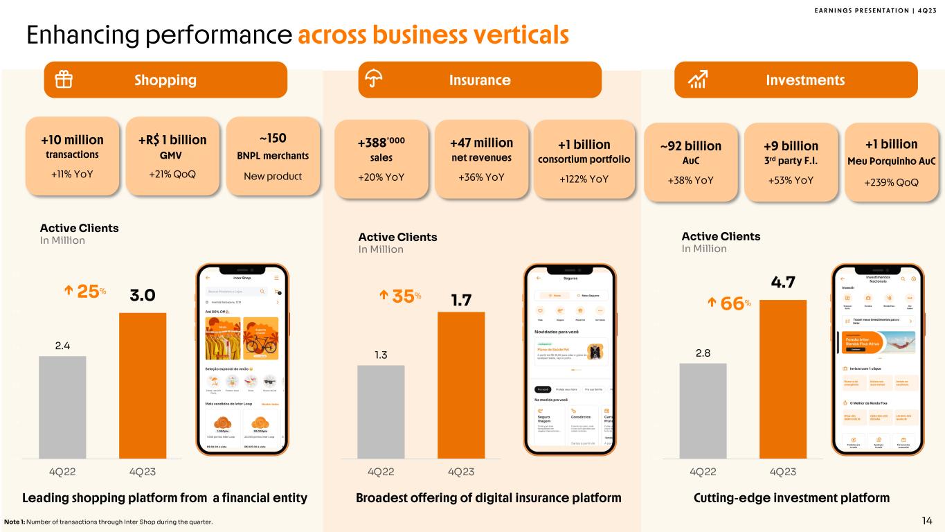 E A R N I N G S P R E S E N T A T I O N | 4 Q 2 3 55% 54% 53% 51% 51% 45% 46% 47% 49% 49% 19 18 20 21 24 158 163 177 198 230 178 181 197 219 253 0. 0 10. 0 20 .0 30 .0 40 .0 50 .0 60 .0 70 .0 4Q22 1Q23 2Q23 3Q23 4Q23 Debit Credit PIX Massive transactional platform: R$ 1 trillion run rate TPV +25% +36% +45% +43% % YoY +15% Cards + PIX TPV1 In R$ Billion Quarters of relationship Cards + PIX TPV per Active Client In R$ Thousand, monthly Sources: Banco Central do Brasil. Note 1: Height of PIX volume was reduced to fit on page. Note 2: Inter’s market share calculated using internal data on total transacted volume in 4Q23; Considers transactions within the Instant Payment System (SPI) only as of 4Q23. 13 Consistent PIX and credit volume growth 0 1 2 3 4 5 6 7 8 9 10 1 2 3 4 5 6 7 8 9 10 11 12 13 14 15 16 17 18 19 20 21 22 23 24 Th ou sa nd s 4Q23 1Q1860% 54% 52% 40% 46% 48% 43 66 83 269 512 768 312 578 851 0. 0 50 .0 100 .0 150 .0 20 0. 0 250 .0 2021 2022 2023 +25% +31% +50% +47% % YoY +20% +43% YoY 7.8% Pix Transactions Market Share 4Q232