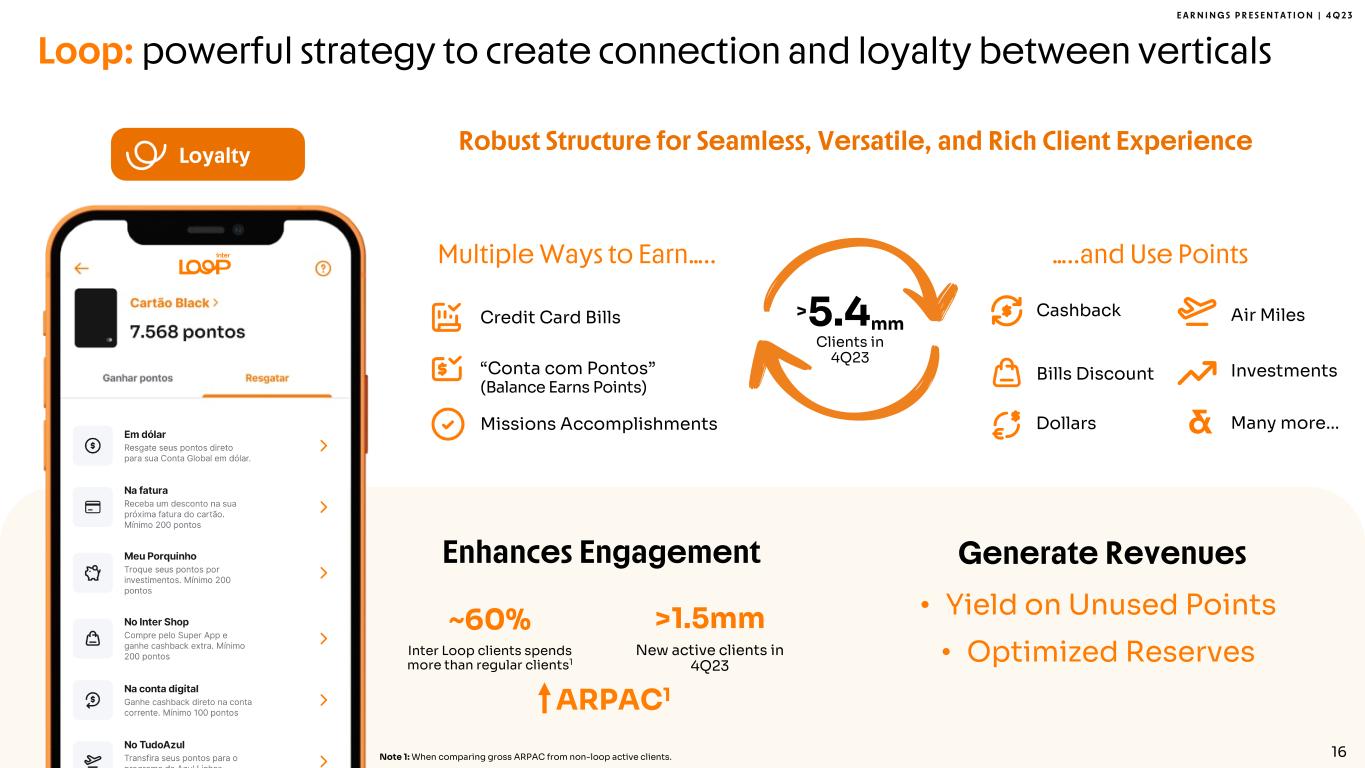 E A R N I N G S P R E S E N T A T I O N | 4 Q 2 3 15 Global: high growth vertical driving engagement within wealthier clients > 2 million Global Clients ~3x More products adoption1 Note 1: Global Clients use 3.0 times more products when compared to active clients average. Note 2: Amount included in Demand Deposit balance on IFRS Financial Statement. Note 3: Assets under Inter&Co Securities Custody. Note 4: Securities under Inter&Co Securities Custody. 6 9 14 20 18 26 10 26 42 49 68 115 149 198 2 4 8 26 41 66 85 121 20 20 20 20 11 30 56 84 142 221 272 364 - 50 100 150 200 25 0 300 35 0 400 1Q22 2Q22 3Q22 4Q22 1Q23 2Q23 3Q23 4Q23 AuC & Deposits in US Dollars In USD Million Assets under Custody3 Deposit balance2 Securities4 Real estate fund US$ 579,97 Global Partnering with US Strong Brands & Many More