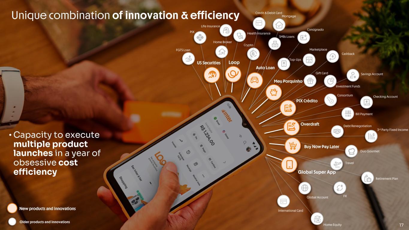 E A R N I N G S P R E S E N T A T I O N | 4 Q 2 3 16 Loop: powerful strategy to create connection and loyalty between verticals • Credit Card Bills • “Conta com Pontos” (Balance Earns Points) • Missions Accomplishments ~60% Inter Loop clients spends more than regular clients1 Robust Structure for Seamless, Versatile, and Rich Client Experience Multiple Ways to Earn….. …..and Use Points Cashback Bills Discount Enhances Engagement Generate Revenues >1.5mm New active clients in 4Q23 ARPAC1 • Yield on Unused Points • Optimized Reserves >5.4mm Clients in 4Q23 Air Miles Investments Dollars Many more…& Now Multiple OptionsLoyalty Note 1: When comparing gross ARPAC from non-loop active clients.