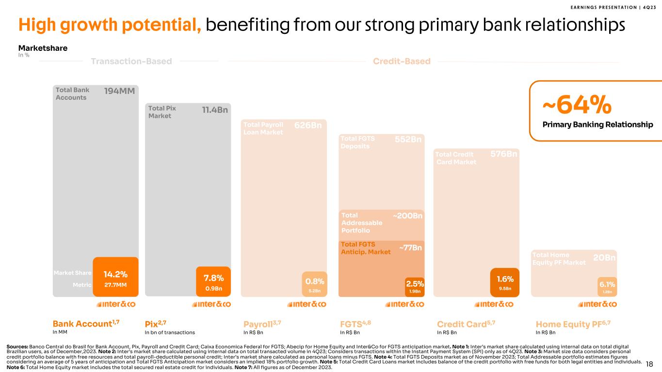 E A R N I N G S P R E S E N T A T I O N | 4 Q 2 3 17 Loop Auto Loan Overdraft Buy Now Pay Later PIX Crédito Meu Porquinho Global Super App US Securities International Card Mortgage FGTS Loan Home Equity Global Account Top-Ups Marketplace Life Insurance Duo Gourmet Retirement Plan Gift Card Home Broker Travel Consignado Credit & Debit Card Health Insurance 3rd Party Fixed Income FX PIX Cashback Savings Account Checking Account SMBs Loans Crypto Consortium Bill Payment Debt Renegotiation Investment Funds New products and innovations Older products and innovations •Capacity to execute multiple product launches in a year of obsessive cost efficiency Unique combination of innovation & efficiency