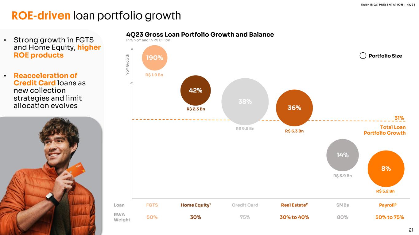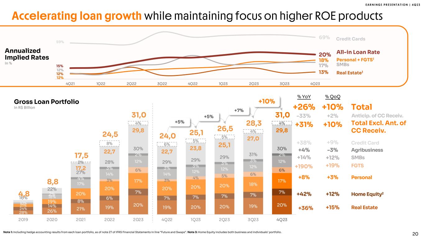 E A R N I N G S P R E S E N T A T I O N | 4 Q 2 3 28% 26% 21% 19% 20% 19% 20% 20% 19% 20% 24% 14% 8% 6% 7% 7% 7% 7% 7% 7% 21% 19% 20% 20% 17% 20% 20% 20% 18% 17%3% 6% 3% 4% 5% 6% 6% 10% 18% 17% 14% 12% 14% 12% 12% 12% 12% 2% 4% 3% 2% 3% 3% 3% 3% 2% 16% 22% 27% 28% 30% 29% 29% 29% 31% 30% 17,2 22,7 29,8 22,7 23,8 25,1 27,0 29,8 2% 8% 4% 6% 5% 5% 4% 4% 4,8 8,8 17,5 24,5 31,0 24,0 25,1 26,5 28,3 31,0 0 .0 5 .0 10 .0 15 .0 2 0. 0 2 5. 0 3 0. 0 3 5. 0 2019 2020 2021 2022 2023 4Q22 1Q23 2Q23 3Q23 4Q23 Accelerating loan growth while maintaining focus on higher ROE products Note 1: Including hedge accounting results from each loan portfolio, as of note 27 of IFRS Financial Statements in line “Future and Swaps”. Note 3: Home Equity includes both business and individuals’ portfolio. +4% +14% +8% +36% +38% +26% +190% -33% % YoY % QoQ Real Estate Personal SMBs Agribusiness Credit Card Total FGTS Anticip. of CC Receiv. +31% Total Excl. Ant. of CC Receiv. Real Estate1 Personal + FGTS1 SMBs Credit Cards Annualized Implied Rates In % All-in Loan Rate -3% +12% +3% +15% +9% +10% +19% +2% +10% +42% Home Equity2+12% 12% 13% 12% 18% 12% 17%15% 20% 59% 69% 0 .0 % 10 .0 % 2 0. 0% 3 0. 0% 4 0. 0% 5 0. 0% 6 0. 0% 7 0. 0% 8 0. 0% 4Q21 1Q22 2Q22 3Q22 4Q22 1Q23 2Q23 3Q23 4Q23 +5% +10% +7% 20 +5% Gross Loan Portfolio In R$ Billion