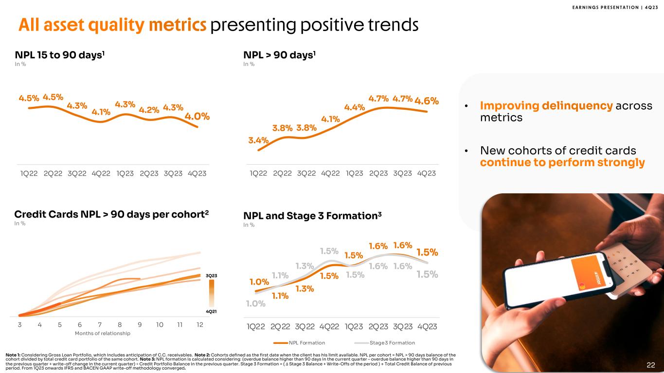 E A R N I N G S P R E S E N T A T I O N | 4 Q 2 3 3 4 5 6 7 8 9 10 11 12 3.4% 3.8% 3.8% 4.1% 4.4% 4.7% 4.7% 4.6% 1Q22 2Q22 3Q22 4Q22 1Q23 2Q23 3Q23 4Q23 4.5% 4.5% 4.3% 4.1% 4.3% 4.2% 4.3% 4.0% 1Q22 2Q22 3Q22 4Q22 1Q23 2Q23 3Q23 4Q23 NPL > 90 days1 In % NPL 15 to 90 days1 In % Note 1: Considering Gross Loan Portfolio, which includes anticipation of C.C. receivables. Note 2: Cohorts defined as the first date when the client has his limit available. NPL per cohort = NPL > 90 days balance of the cohort divided by total credit card portfolio of the same cohort. Note 3: NPL formation is calculated considering: (overdue balance higher than 90 days in the current quarter – overdue balance higher than 90 days in the previous quarter + write-off change in the current quarter) ÷ Credit Portfolio Balance in the previous quarter. Stage 3 Formation = ( Δ Stage 3 Balance + Write-Offs of the period ) ÷ Total Credit Balance of previous period. From 1Q23 onwards IFRS and BACEN GAAP write-off methodology converged. Credit Cards NPL > 90 days per cohort2 In % 1.0% 1.1% 1.3% 1.5% 1.5% 1.6% 1.6% 1.5% 1.0% 1.1% 1.3% 1.5% 1.5% 1.6% 1.6% 1.5% 0 .6 % 0 .8 % 1. 0% 1. 2% 1. 4% 1. 6% 1. 8% 2 .0 % 2 .2 % 1Q22 2Q22 3Q22 4Q22 1Q23 2Q23 3Q23 4Q23 NPL Formation Stage 3 Formation NPL and Stage 3 Formation3 In % All asset quality metrics presenting positive trends • Improving delinquency across metrics • New cohorts of credit cards continue to perform strongly Months of relationship 3Q23 4Q21 22