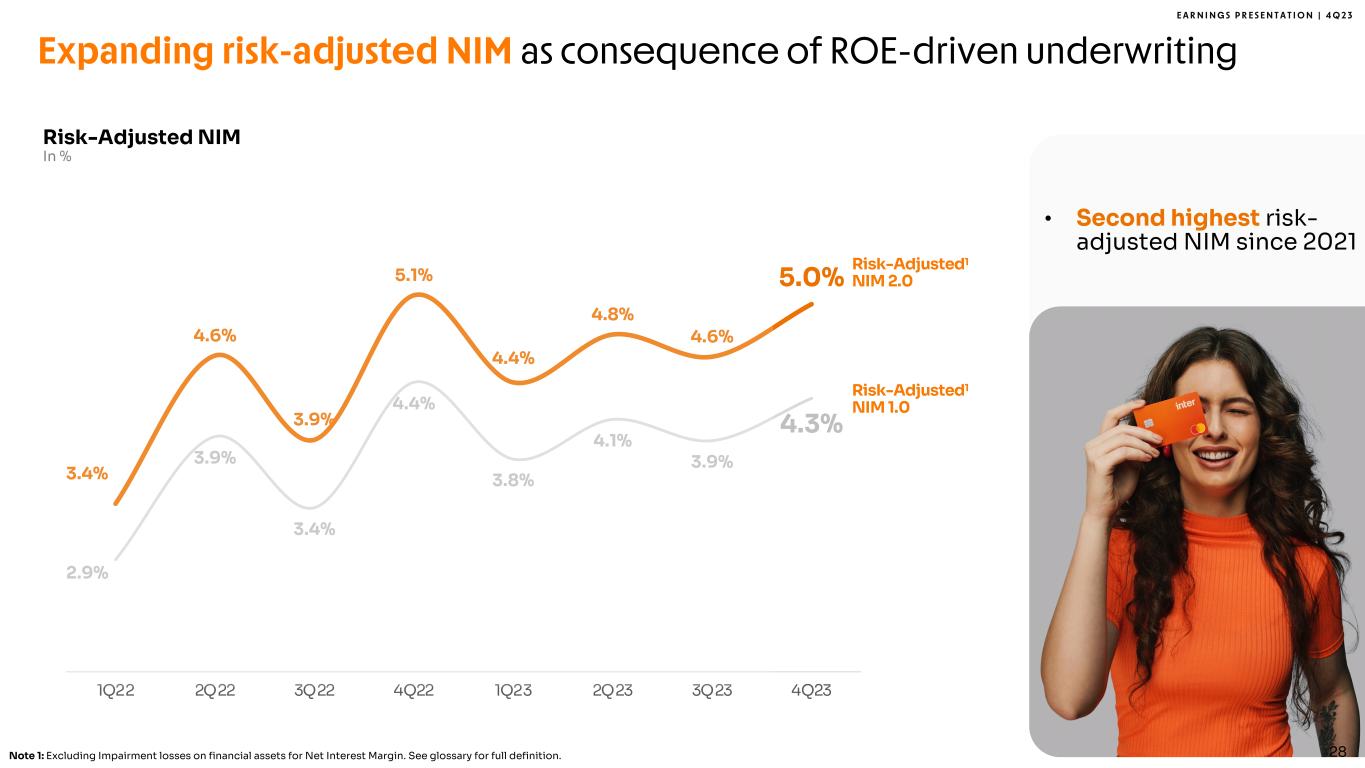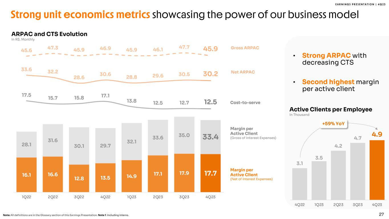 E A R N I N G S P R E S E N T A T I O N | 4 Q 2 3 Strong unit economics metrics showcasing the power of our business model ARPAC and CTS Evolution In R$, Monthly 16.1 16.6 12.8 13.5 14.9 17.1 17.9 17.7 28.1 31.6 30.1 29.7 32.1 33.6 35.0 33.4 45.6 47.3 45.9 46.9 45.9 46.1 47.7 45.9 33.6 32.2 28.6 30.6 28.8 29.6 30.5 30.2 17.5 15.7 15.8 17.1 13.8 12.5 12.7 12.5 1Q22 2Q22 3Q22 4Q22 1Q23 2Q23 3Q23 4Q23 Cost-to-serve Margin per Active Client (Net of Interest Expenses) Margin per Active Client (Gross of Interest Expenses) Net ARPAC Gross ARPAC • Strong ARPAC with decreasing CTS • Second highest margin per active client Note: All definitions are in the Glossary section of this Earnings Presentation. Note 1: Including interns. 27 3.1 3.5 4.2 4.7 4.9 1.0 1.5 2. 0 2. 5 3. 0 3. 5 4. 0 4. 5 5. 0 5. 5 4Q22 1Q23 2Q23 3Q23 4Q23 Active Clients per Employee In Thousand +59% YoY