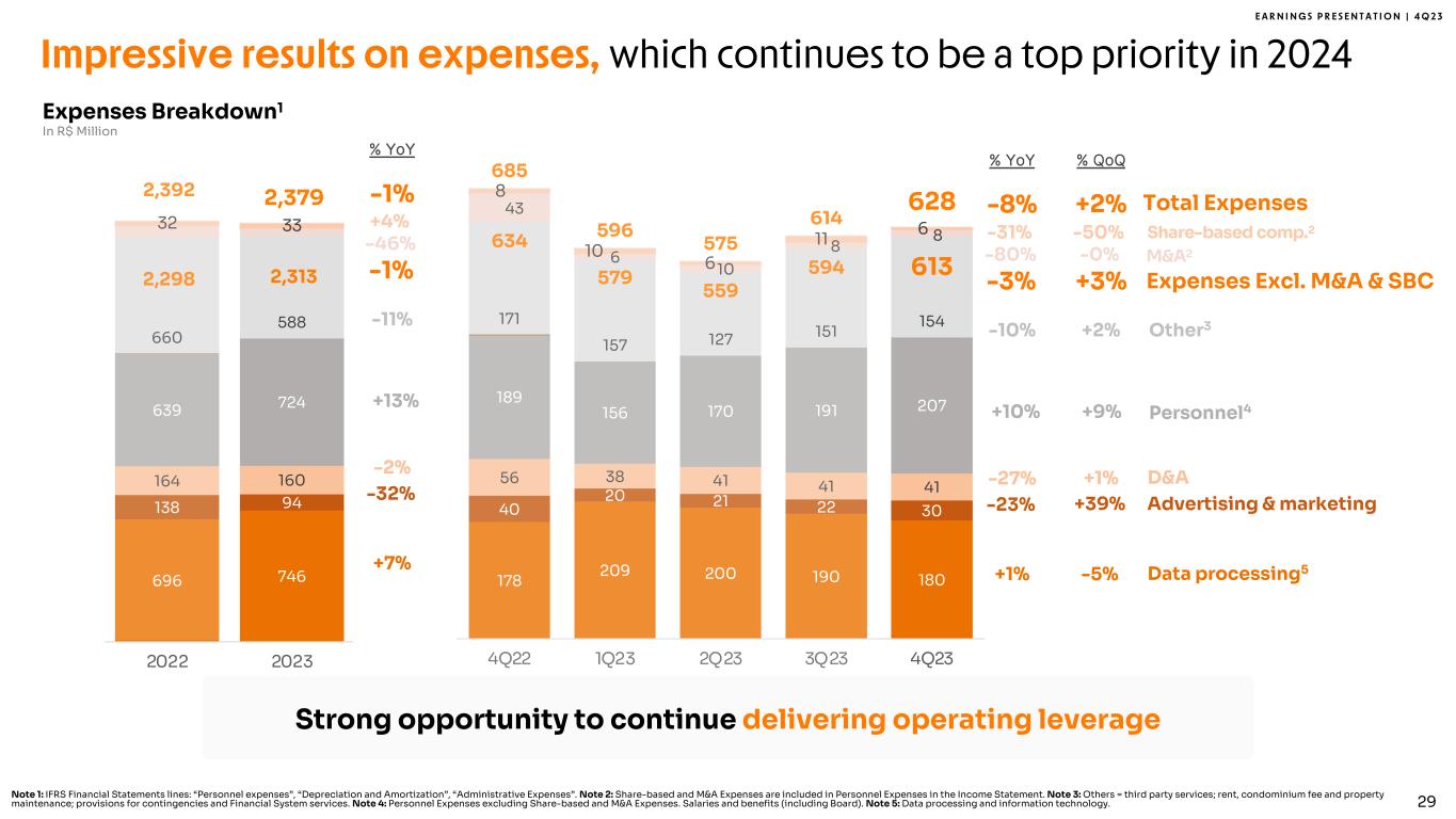 E A R N I N G S P R E S E N T A T I O N | 4 Q 2 3 % YoY -8% -10% +1% -23% % QoQ +2% +2% -5% +39% Data processing5 Advertising & marketing Other3 M&A2 Impressive results on expenses, which continues to be a top priority in 2024 Total Expenses -3% +3% Expenses Excl. M&A & SBC -27% +1% D&A +10% +9% Personnel4 Share-based comp.2 Expenses Breakdown1 In R$ Million Strong opportunity to continue delivering operating leverage Note 1: IFRS Financial Statements lines: “Personnel expenses”, “Depreciation and Amortization”, “Administrative Expenses”. Note 2: Share-based and M&A Expenses are included in Personnel Expenses in the Income Statement. Note 3: Others = third party services; rent, condominium fee and property maintenance; provisions for contingencies and Financial System services. Note 4: Personnel Expenses excluding Share-based and M&A Expenses. Salaries and benefits (including Board). Note 5: Data processing and information technology. 178 209 200 190 180 40 20 21 22 30 56 38 41 41 41 189 156 170 191 207 171 157 127 151 154 634 579 559 594 613 43 6 10 8 8 8 10 6 11 6 685 596 575 614 628 - 50 5 0 15 0 2 50 3 50 4 50 5 50 6 50 7 50 4Q22 1Q23 2Q23 3Q23 4Q23 -80% -0% -31% -50% 29 696 746 138 94 164 160 639 724 660 588 2,298 2,313 32 33 2,392 2,379 0 5 0 10 0 0 15 0 0 2 0 0 2 50 0 3 0 0 2022 2023 % YoY -1% -11% +7% -32% -1% -2% +13% -46% +4%