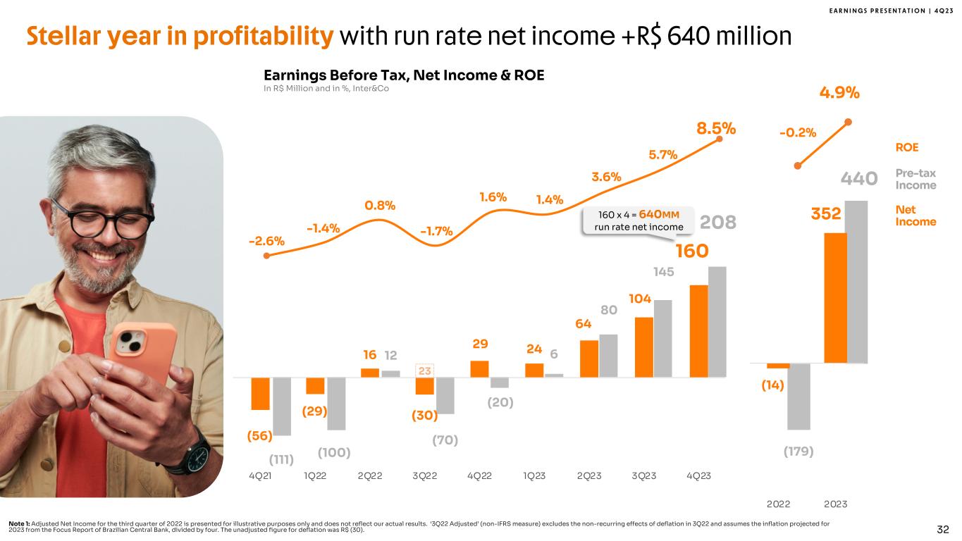 E A R N I N G S P R E S E N T A T I O N | 4 Q 2 3 (179) 440 -350 -250 -150 -50 50 150 250 350 450 550 (14) 352 -350 -250 -150 -50 50 150 250 350 450 550 2022 2023 Note 1: Adjusted Net Income for the third quarter of 2022 is presented for illustrative purposes only and does not reflect our actual results. ‘3Q22 Adjusted’ (non-IFRS measure) excludes the non-recurring effects of deflation in 3Q22 and assumes the inflation projected for 2023 from the Focus Report of Brazilian Central Bank, divided by four. The unadjusted figure for deflation was R$ (30). Earnings Before Tax, Net Income & ROE In R$ Million and in %, Inter&Co Pre-tax Income Net Income ROE 32 Stellar year in profitability with run rate net income +R$ 640 million -0.2% 4.9% -10.0% -8.0% -6.0% -4.0% -2.0% 0.0% 2.0% 4.0% 6.0% 8.0% 10.0% (111) (100) 12 (70) (20) 6 80 145 208 -200 -100 0 100 200 300 400 (56) (29) 16 (30) 29 24 64 104 160 23 -150 -50 50 150 250 350 4Q21 1Q22 2Q22 3Q22 4Q22 1Q23 2Q23 3Q23 4Q23 -2.6% -1.4% 0.8% -1.7% 1.6% 1.4% 3.6% 5.7% 8.5% -4.0% -2.0% 0.0% 2.0% 4.0% 6.0% 8.0% 10.0% 160 x 4 = 640MM run rate net income