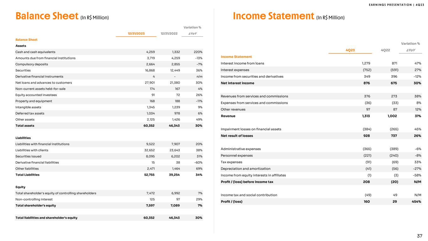 E A R N I N G S P R E S E N T A T I O N | 4 Q 2 3 Stable Tier 1 capital 29.8% 24.1% 23.0% 22.8% 23.7% 23.0% 3Q22 4Q22 1Q23 2Q23 3Q23 4Q23 Tier I Ratio In % Source: 3Q23 Banco Inter Bacen GAAP Financial Statements. • Capital ratio comprised exclusively of high-quality core Tier I capital • Several opportunities to continue redeploying capital into loan growth 36 12% 2% 3% 3% -4% 6% 11% 11% 2% 5% 7% 10% -5% 0% 5% 10% 15% Loan Portfolio Growth QoQ RWA Growth QoQ